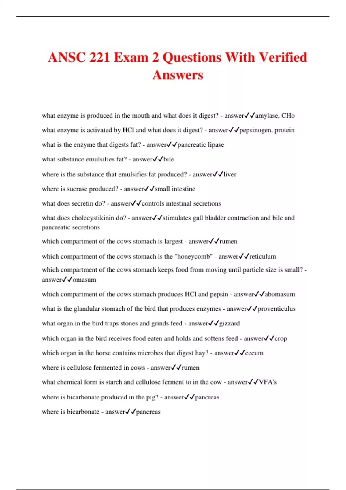 ANSC 221 Exam 2 Questions With Verified Answers what enzyme is produced in the mouth and what does it digest? - answeramylase, CHo what enzyme is activated by HCl and what does it digest? - answerpepsinogen, protein what is the enzyme that digests fat? - answerpancreatic lipase what substance emulsifies fat? - answerbile where is the substance that emulsifies fat produced? - answerliver where is sucrase produced? - answersmall intestine what does secretin do? - answercontrols intestinal secretions what does cholecystikinin do? - answerstimulates gall bladder contraction and bile and pancreatic secretions which compartment of the cows stomach is largest - answerrumen which compartment of the cows stomach is the "honeycomb" - answerreticulum which compartment of the cows stomach keeps food from moving until particle size is small? - answeromasum which compartment of the cows stomach produces HCl and pepsin - answerabomasum what is the glandular stomach of the bird that produces enzymes - answerproventiculus what organ in the bird traps stones and grinds feed - answergizzard which organ in the bird receives food eaten and holds and softens feed - answercrop which organ in the horse contains microbes that digest hay? - answercecum where is cellulose fermented in cows - answerrumen what chemical form is starch and cellulose ferment to in the cow - answerVFA's where is bicarbonate produced in the pig? - answerpancreas where is bicarbonate - answerpancreas where is trypsin produced - answerpancreas what is being analyzed when ether is passed through a sample - answerfat(lipids) what is being analyzed when nitrogen is determined by Kjeldahl - answercrude protein what is being analyzed when the sample is boiled in acid and alkali - answercrude fiber what are the newer methods for fiber determination - answerdetergent methods what is TDN used for? - answerenergy index what is the effect of test weight on feeding value - answerlittle to none two proteins are fed and pigs grow better on protein 1 than 2. the feed is not toxic. what are the two factors that best explain why - answerdigestibility of protein how well digested protein will be utilized which category of energy represents what an animal can actually use for productive purposes - answerNet E what grain was probably eaten by people in salem, MA in early american history and was likely involved in the salem witch trial incident (ergot) - answerrye what feed may likely contain gossypol - answercottonseed what feed needs to be toasted to destroy trypsin inhibitor - answersoybean list 4 grains - answercorn, wheat, oats, barley list 4 protein source feed - answersoybean meal, cottonseed meal, linseed meal sunflower list 4 byproduct feeds of grain processing: - answercorn gluten meal, wheat bran, wheat middlings, Hominy feeds list 2 different (not wet vs dry) feeds from the brewing industry: - answerspent hops, brewers yeast list 2 different feeds from distilling industry - answerdistillers grains, distillers dried yeast describe how protein digestion occurs in cattle (include DIP and UIP to be complete) - answerdegradable intake protein- the protein that is soluble and available to the microbes undegradable intake protein- the protein that is insoluble and unavailable to the microbes aflatoxin: