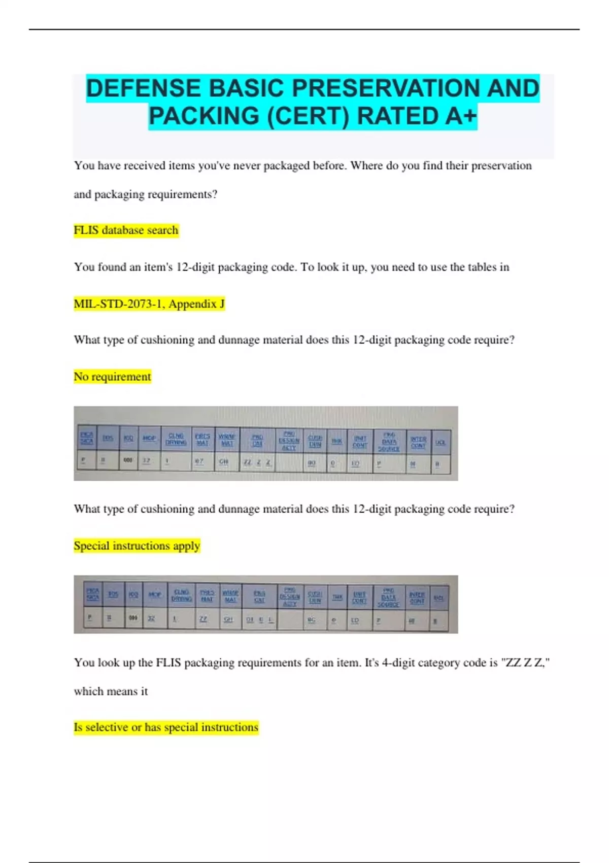 DEFENSE BASIC PRESERVATION AND PACKING (CERT) RATED A+ You have received items you've never packaged before. Where do you find their preservation and packaging requirements? FLIS database search You found an item's 12-digit packaging code. To look it up, you need to use the tables in MIL-STD-2073-1, Appendix J What type of cushioning and dunnage material does this 12-digit packaging code require? No requirement What type of cushioning and dunnage material does this 12-digit packaging code require? Special instructions apply You look up the FLIS packaging requirements for an item. It's 4-digit category code is "ZZ Z Z," which means it Is selective or has special instructions You need to clean an item that you have not handled before. To determine its cleaning process, you check the item's 12-digit packaging code An item has a cleaning code of "I." What does that mean? You decide the bet way to clean the item without injuring the item. Which statement is NOT a basic cleaning and drying requirement? Avoid manually drying items To decide the best cleaning process ( or processes ) for an item, you should consider the type of contaminant(s) and the item's characteristics An item requires immediate, heat-based drying. Using the approved drying process, you can either put the item under an infrared lamp or put it in a heated-air oven Which of the approved drying processes DO NOT use heat? - Allowing the item to drip-dry in a drainer - Wiping the item dry with lint-free cloths - Blowing off moisture with compressed air Which publication defines item preservation requirements for military items? MIL- STD-2073-1 Where would you go to find out which preservative material this item requires? MIL- STD-2073-1, Table J-III Which type of preservative releases vapors that form an invisible protective film around an item to protect it from corrosion? Volatile Corrosion Inhibitors ( VCI ) Where would you go to find out which cushioning material this item requires MIL- STD-2073-1, Table J-V Which of these preservatives is considered permanent? Paint You're packaging an item that requires A-A-59135