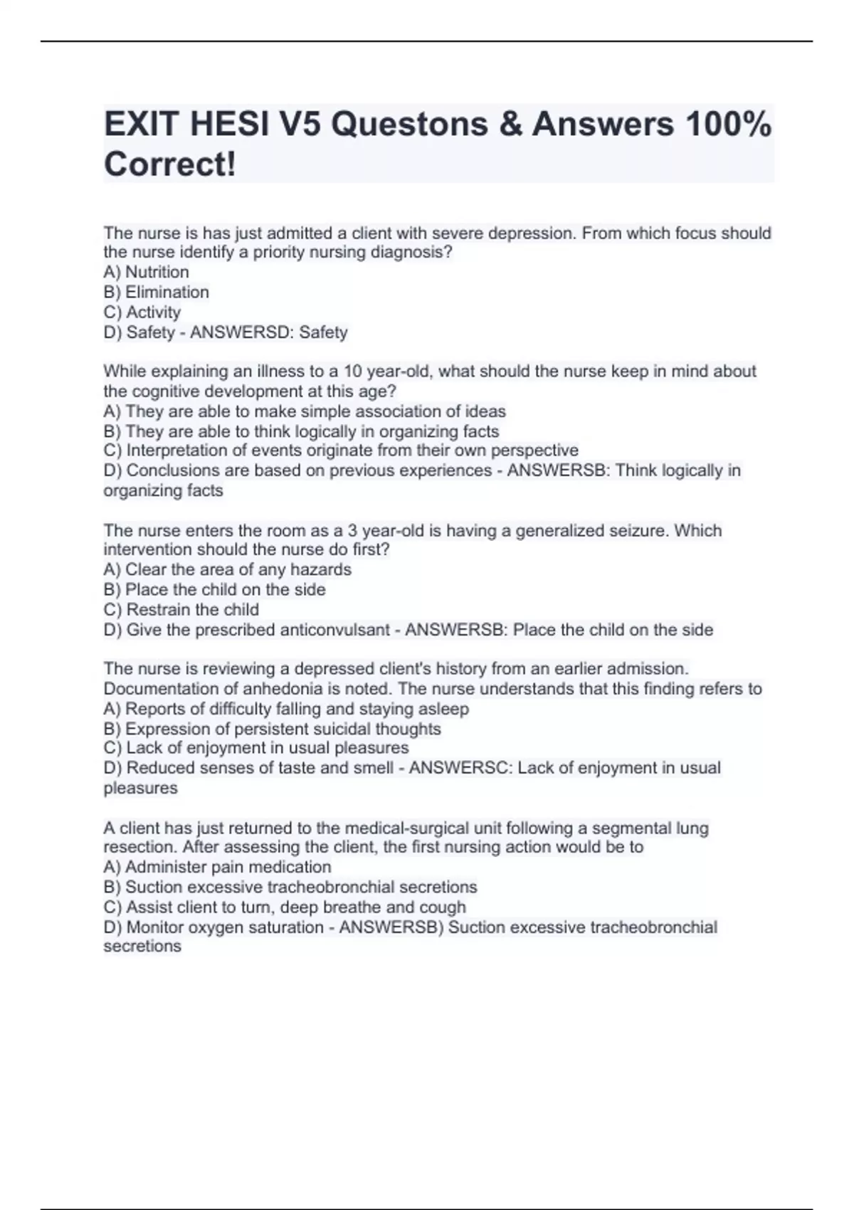 The nurse is has just admitted a client with severe depression. From which focus should the nurse identify a priority nursing diagnosis? A) Nutrition B) Elimination C) Activity D) Safety - ANSWERSD: Safety While explaining an illness to a 10 year-old, what should the nurse keep in mind about the cognitive development at this age? A) They are able to make simple association of ideas B) They are able to think logically in organizing facts C) Interpretation of events originate from their own perspective D) Conclusions are based on previous experiences - ANSWERSB: Think logically in organizing facts The nurse enters the room as a 3 year-old is having a generalized seizure. Which intervention should the nurse do first? A) Clear the area of any hazards B) Place the child on the side C) Restrain the child D) Give the prescribed anticonvulsant - ANSWERSB: Place the child on the side The nurse is reviewing a depressed client's history from an earlier admission. Documentation of anhedonia is noted. The nurse understands that this finding refers to A) Reports of difficulty falling and staying asleep B) Expression of persistent suicidal thoughts C) Lack of enjoyment in usual pleasures D) Reduced senses of taste and smell - ANSWERSC: Lack of enjoyment in usual pleasures A client has just returned to the medical-surgical unit following a segmental lung resection. After assessing the client, the first nursing action would be to A) Administer pain medication B) Suction excessive tracheobronchial secretions C) Assist client to turn, deep breathe and cough D) Monitor oxygen saturation - ANSWERSB) Suction excessive tracheobronchial secretions While assessing a client in an outpatient facility with a panic disorder, the nurse completes a thorough health history and physical exam. Which finding is most significantfor this client? A