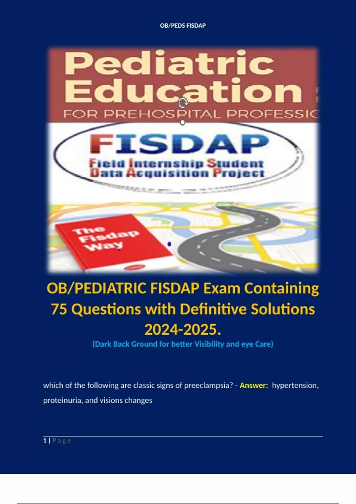 OB/PEDIATRIC FISDAP Exam Containing 75 Questions with Definitive Solutions . Terms like: which of the following are classic signs of preeclampsia? - Answer: hypertension, proteinuria, and visions changes