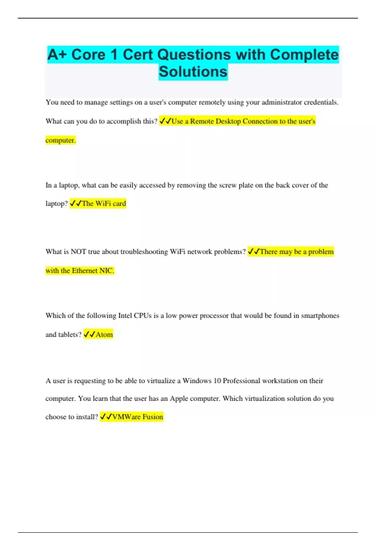 A+ Core 1 Cert Questions with Complete Solutions You need to manage settings on a user's computer remotely using your administrator credentials. What can you do to accomplish this? Use a Remote Desktop Connection to the user's computer. In a laptop, what can be easily accessed by removing the screw plate on the back cover of the laptop? The WiFi card What is NOT true about troubleshooting WiFi network problems? There may be a problem with the Ethernet NIC. Which of the following Intel CPUs is a low power processor that would be found in smartphones and tablets? Atom A user is requesting to be able to virtualize a Windows 10 Professional workstation on their computer. You learn that the user has an Apple computer. Which virtualization solution do you choose to install? VMWare Fusion When you bootup your brand-new computer, you hear a single short beep, but the screen is blank. You are using a "known-good" monitor that is connected properly and turned on. What could be the problem? There is a problem with the graphics card. Which of the following Hypervisors is included with Windows 10 Professional? Hyper-V Which term does NOT refer to a variant of the full-size Secure Digital (SD) memory card? Micro-SD What service uses port 110? Post Office Protocol 3 (POP3) Which of the following is the addressing scheme that uses a 128-bit number for each address? IPv6 When troubleshooting a PC, what is a good way to analyze the computer problem systematically? Work in layers. If you have an intermittent problem in the structured cabling, what can you do to determine its cause? Use cable testing tools. What are most persistent CD writing problems associated with? Buffer underruns Which type of server uses a distributed database that contains information on domains and hosts within those domains? DNS server Which of the following connectors can have audio and video pass through it? High Definition Multimedia Interface (HDMI) Which cloud deployment type is targeted towards only a certain group of users? Community Employees in your organization regularly need to print sensitive documents. The employees properly dispose of the hard copies of these documents. How can you ensure that electronic copies of these documents are not leaked to unauthorized users after the documents are printed? Regularly purge the hard drive caches of all network printers. What purpose does the Fn key on a laptop fulfill? Special functions You need to configure a SOHO (Small Office Home Office) network to be easily discovered by guest users. Which feature should be configured? SSID (Service Set Identifier) Which of the following ACPI (Advanced Configuration and Power Interface) power modes would cut power to most of a laptop's devices and peripherals, but would maintain power to system memory to save the system's state when the battery may be running low? Standby Which cloud deployment type uses both private and public cloud features? Hybrid After the boot sector code loads the OS files into system memory, what can the error messages you receive on your Windows 10 computer be attributed to? Driver problems Which one of these notable corporate features of Windows Pro, Enterprise, Ultimate, and Education editions encrypt all the data on a drive? BitLocker What distance between hosts could mean multiple connected networks in the same municipality? MAN (Metropolitan Area Network)