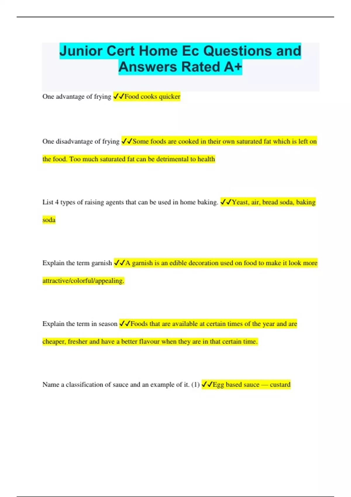Junior Cert Home Ec Questions and Answers Rated A+ One advantage of frying Food cooks quicker One disadvantage of frying Some foods are cooked in their own saturated fat which is left on the food. Too much saturated fat can be detrimental to health List 4 types of raising agents that can be used in home baking. Yeast, air, bread soda, baking soda Explain the term garnish A garnish is an edible decoration used on food to make it look more attractive/colorful/appealing. Explain the term in season Foods that are available at certain times of the year and are cheaper, fresher and have a better flavour when they are in that certain time. Name a classification of sauce and an example of it. (1) Egg based sauce — custard Name a classification of sauce and an example of one. (2) Fruit sauces — apple sauces Give two effects of cooking on meat. Some Vit.B is destroyed, fat melts Outline the advantages of home baking. (Expand in exam) Better flavour, no artificial preservatives, ingredients can be controlled and special diets Explain how yeast works. Yeast produces CO2 in the dough, heat from the oven causes this to rise and it forms a crust. Explain how air, as a raising agent, works. The heat of the oven causes the air to expand and this rises the dough. Explain the term, fortified foods These are foods that have extra vitamins and minerals added to them during processing to replace ones that might have been missing or lost. Explain the term, purée This is a sieved/liquidized mixture of food Four foods that are a good source of HBV protein are: Meat, fish, eggs and yoghurt. Name two methods of cake making and an example of a cake made using each method. Whisking: sponge cake, All in one: chocolate cake. What two foods are a good source of Vitamin C? Oranges and lemons What two foods are a good source of calcium? Milk and cheese. Name a deficiency of fibre Constipation Name a deficiency of Vitamin C Scurvy Name a deficiency of iron Anaemia Name a deficiency of Vitamin A Night blindness Name two bacteria that may be found in foods which