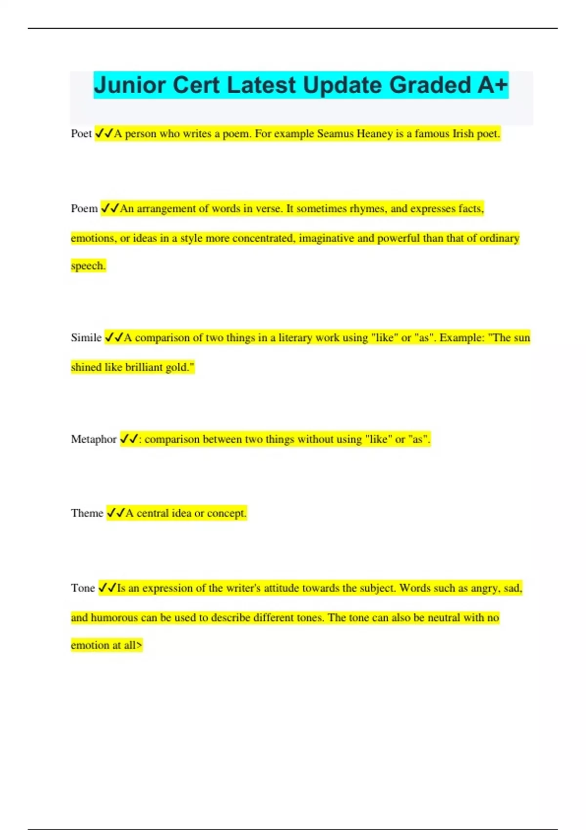 Junior Cert Latest Update Graded A+ Poet A person who writes a poem. For example Seamus Heaney is a famous Irish poet. Poem An arrangement of words in verse. It sometimes rhymes, and expresses facts, emotions, or ideas in a style more concentrated, imaginative and powerful than that of ordinary speech. Simile A comparison of two things in a literary work using "like" or "as". Example: "The sun shined like brilliant gold." Metaphor : comparison between two things without using "like" or "as". Theme A central idea or concept. Tone Is an expression of the writer's attitude towards the subject. Words such as angry, sad, and humorous can be used to describe different tones. The tone can also be neutral with no emotion at all> Stanza A fixed number of lines of verse forming a unit of a poem Alliteration Example: Peter Piper Picked Pickled Pepper The repeating of the same letter or sound, especially consonant sounds. Onomatopoeia Is the use of words that imitate sounds. Whirr, thud, sizzle, and hiss are typical examples. Repetition The reappearance of a sound, a word, a phrase, a stanza, or other structure in any literary work.