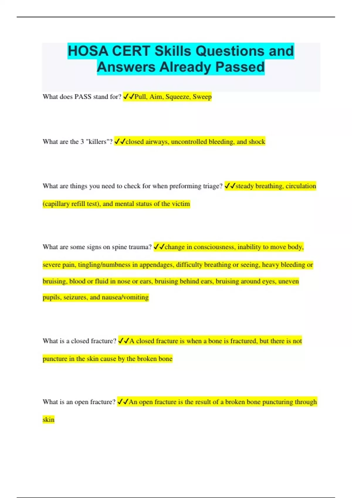 HOSA CERT Skills Questions and Answers Already Passed What does PASS stand for? Pull, Aim, Squeeze, Sweep What are the 3 "killers"? closed airways, uncontrolled bleeding, and shock What are things you need to check for when preforming triage? steady breathing, circulation (capillary refill test), and mental status of the victim What are some signs on spine trauma? change in consciousness, inability to move body, severe pain, tingling/numbness in appendages, difficulty breathing or seeing, heavy bleeding or bruising, blood or fluid in nose or ears, bruising behind ears, bruising around eyes, uneven pupils, seizures, and nausea/vomiting What is a closed fracture? A closed fracture is when a bone is fractured, but there is not puncture in the skin cause by the broken bone What is an open fracture? An open fracture is the result of a broken bone puncturing through skin What is a displaced fracture? a displaced fracture is a bone breaking into 2 or more pieces that is not connected anymore What is a nondisplaced fracture? a nondisplaced fracture is a broken bone with just a snap. It can be hard to see because it is just a crack in a bone, no movement of a bone What body temperature does a patient have to have to consider hypothermia as a diagnosis? 95 degrees fahrenhiet or less What 3 factors are needed for a fire to start? some sort of fuel, oxygen (or oxidizing substance), and heat What is the most important factor to look at when choosing a fire extinguisher? The fuel used to start the fire (classification) What is a class A fire caused by? ordinary combustibles What is a class B fire caused by? flammable liquids What is a class C fire caused by? Electrical items What is a class D fire caused by? combustible metals What is a class K fire caused by? things found in kitchens (cooking oils, fats) What fire(s) can a water extinguisher be used on? Class A What fire(s) can a foam extinguisher be used on? Class A, B, and D What fire(s) can a dry powder extinguisher be used on? Class A, B, C, and D What fire(s) can a Carbon Dioxide extinguisher be used on? Class B, D, and K What is a CERT members #1 priority? PERSONAL SAFETY