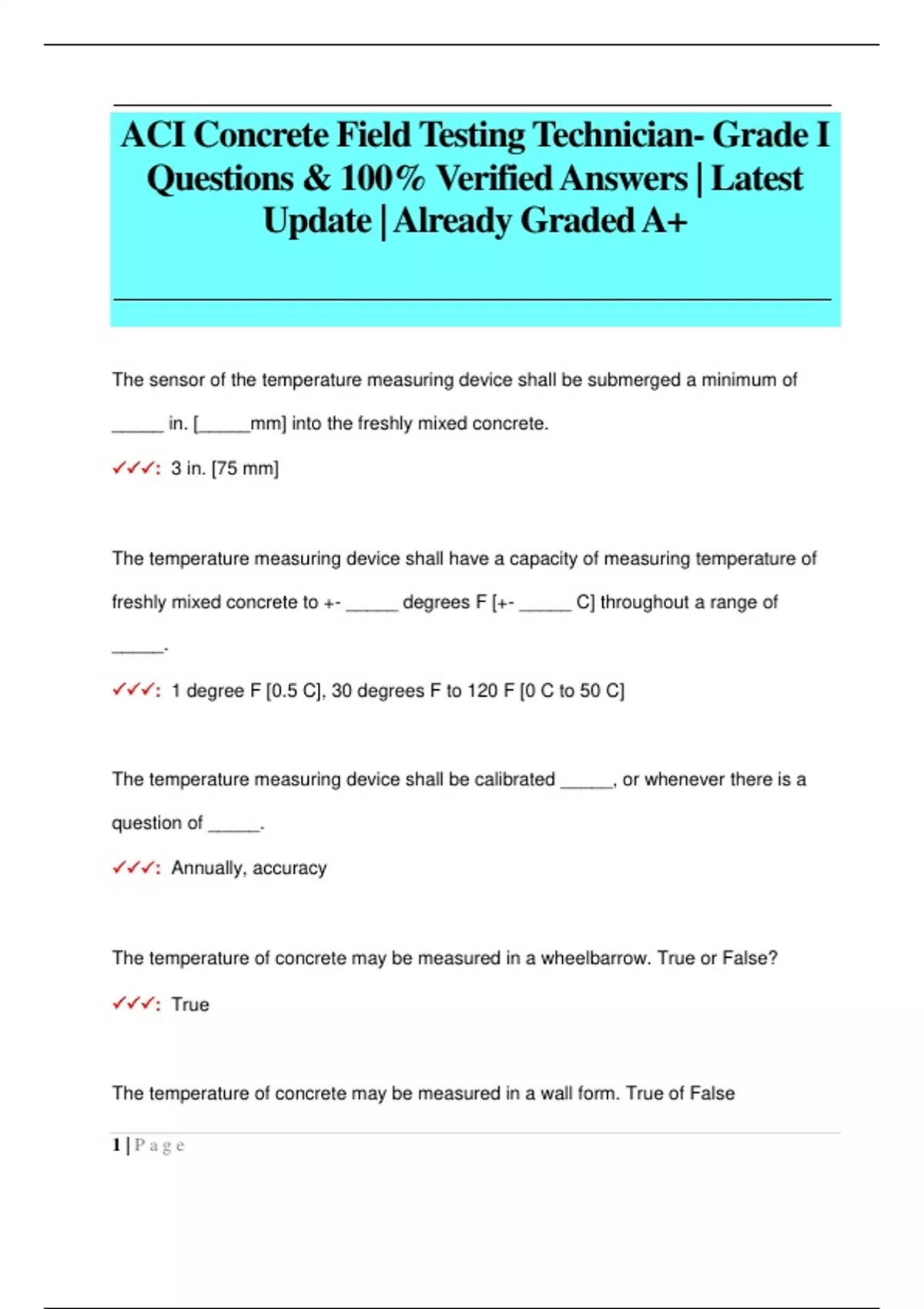 ACI Concrete Field Testing Technician- Grade I Questions & 100% Verified Answers | Latest Update | Already Graded A+