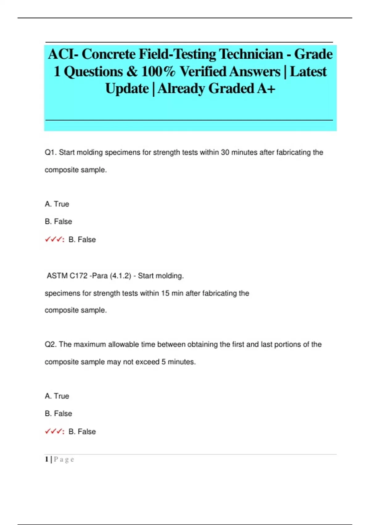 ACI- Concrete Field-Testing Technician - Grade 1 Questions & 100% Verified Answers | Latest Update | Already Graded A+
