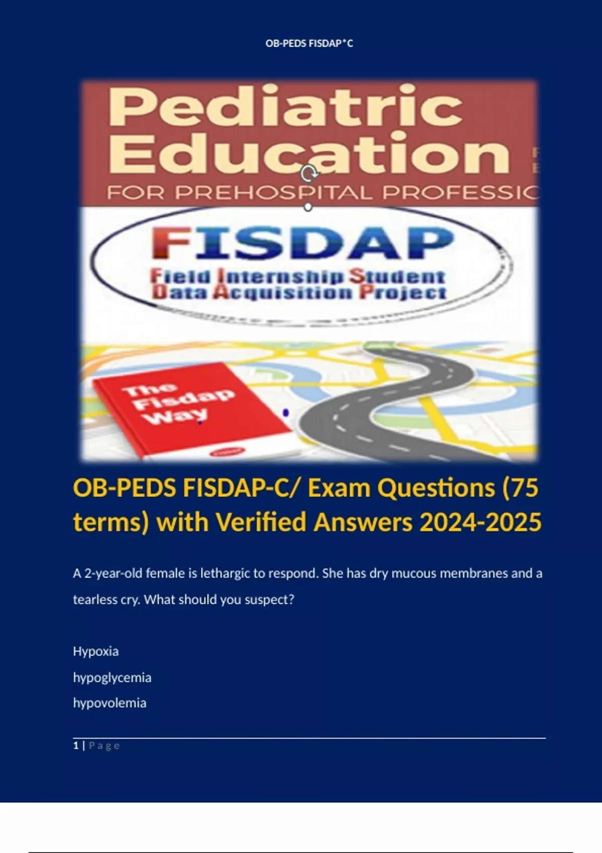 OB-PEDS FISDAP-C/ Exam Questions (75 terms) with Verified Answers . Terms like: A 2-year-old female is lethargic to respond. She has dry mucous membranes and a tearless cry. What should you suspect? Hypoxia hypoglycemia hypovolemia hypothermia Dehydration - Answer: hypovolemia