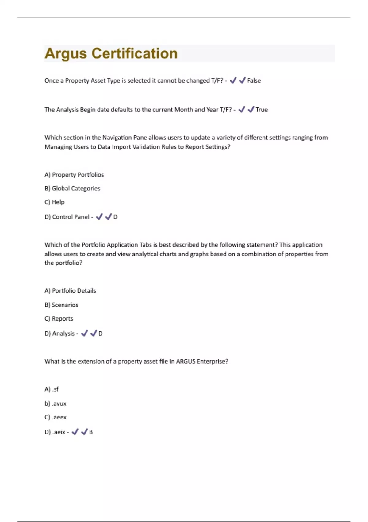 Once a Property Asset Type is selected it cannot be changed T/F? - False The Analysis Begin date defaults to the current Month and Year T/F? - True Which section in the Navigation Pane allows users to update a variety of different settings ranging from Managing Users to Data Import Validation Rules to Report Settings? A) Property Portfolios B) Global Categories C) Help D) Control Panel - D Which of the Portfolio Application Tabs is best described by the following statement? This application allows users to create and view analytical charts and graphs based on a combination of properties from the portfolio? A) Portfolio Details B) Scenarios C) Reports D) Analysis - D What is the extension of a property asset file in ARGUS Enterprise? A) .sf b) .avux C) .aeex D) .aeix - B_____ saves the updates to the property asset model to the database. If a calculation has been performed, it also saves the latest calculation results. A) Refresh B) Save Property to File C) Check In/Out Property D) Save Property - D