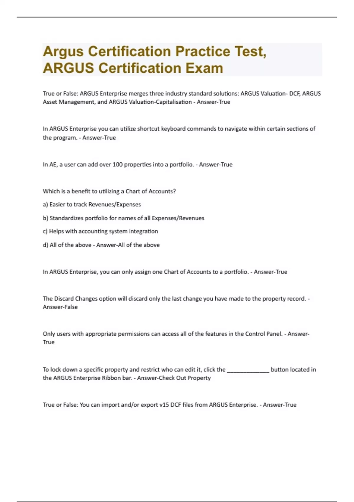 True or False: ARGUS Enterprise merges three industry standard solutions: ARGUS Valuation- DCF, ARGUS Asset Management, and ARGUS Valuation-Capitalisation - Answer-True In ARGUS Enterprise you can utilize shortcut keyboard commands to navigate within certain sections of the program. - Answer-True In AE, a user can add over 100 properties into a portfolio. - Answer-True Which is a benefit to utilizing a Chart of Accounts? a) Easier to track Revenues/Expenses b) Standardizes portfolio for names of all Expenses/Revenues c) Helps with accounting system integration d) All of the above - Answer-All of the above In ARGUS Enterprise, you can only assign one Chart of Accounts to a portfolio. - Answer-True The Discard Changes option will discard only the last change you have made to the property record. - Answer-False Only users with appropriate permissions can access all of the features in the Control Panel. - AnswerTrue To lock down a specific property and restrict who can edit it, click the _____________ button located in the ARGUS Enterprise Ribbon bar. - Answer-Check Out Property True or False: You can import and/or export v15 DCF files from ARGUS Enterprise. - Answer-TrueThe Expense Inflation Rate will be the default percentage for: a) Operating Expenses b) Non-Operating Expenses c) Capital Expenses d) All of the above - Answer-All of the above True or False: Every inflation category must be given a number or it will default to the General Inflation Rate. - Answer-False Assuming a 60% occupancy, calculate the Vending Machine revenue in Year 1 of the analysis (revenue is $13,000 with fixed percentage of 0%). - Answer-$7,800 (.6*13000) Assuming a 0% occupancy, calculate the Vending Machine revenue in Year 1 of the analysis. - Answer-$0 Assuming 100% occupancy, calculate the Vending Machine revenue in Year 1 of the analysis. - Answer- $13,000 What is the Capital Expense amount that will appear on the Cash Flow? - Answer-$63,654??? Free Rent, by default, kick in at the beginning of the _________. - Answer-Tenant's Lease Start Date The default recovery structure in ARGUS enterprise is __________. - Answer-Net The Available Date column in the Tenants - Rent Roll, represents the start of the tenant's lease. - AnswerFalse. The Start Date represents the start of the tenants lease.