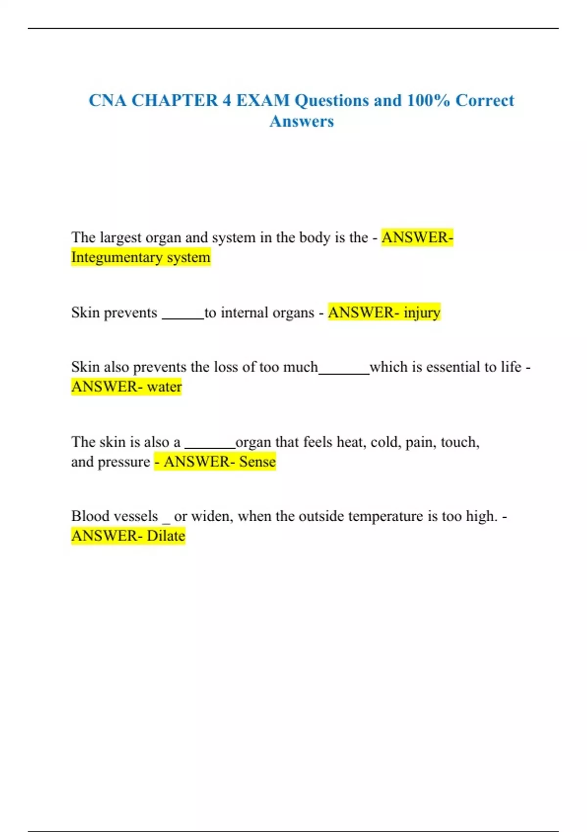 CNA CHAPTER 4 EXAM Questions and 100% Correct Answers The largest organ and system in the body is the - ANSWER- Integumentary system