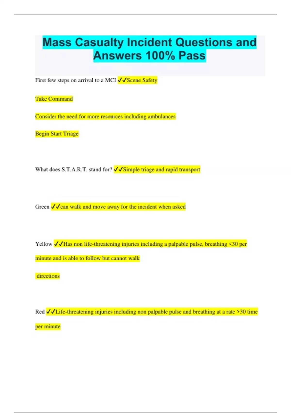 Mass Casualty Incident Questions and Answers 100% Pass First few steps on arrival to a MCI Scene Safety Take Command Consider the need for more resources including ambulances Begin Start Triage What does S.T.A.R.T. stand for? Simple triage and rapid transport Green can walk and move away for the incident when asked Yellow Has non life-threatening injuries including a palpable pulse, breathing <30 per minute and is able to follow but cannot walk directions Red Life-threatening injuries including non palpable pulse and breathing at a rate >30 time per minute Black After opening the airway the patient remaining pulseless and apneic What to do to all patients before moving to the next patient for triage Take care of life threats including opening the airway and stopping or slowing down major bleeding (can use "green" victims to help apply pressure to bleeds) Triage Team 1. Utilize S.T.A.R.T. Triage 2. Apply color bands to the patients 3. Get an accurate count of the patients and their colors 4. Relay information to Triage Unit Leader Triage Unit Leader 1. Relay patient count to the IC 2. Reassign triage teams to litter bearers and treatment 3. Establish a morgue if needed Incident Commander 1. Establish Command 2. Assign ICS positions as resources arrive Medical Comm 1. Establish contact with the receiving hospitals 2. Maintain bed availability log 3. Provide ambulance destination to the Transport Unit Leader Treatment Unit Leader 1. Assign treatment area managers and establish treatment areas 2. Provide managers position tools 3. Ensure treatment areas have adequate resources 4. Coordinate with transport for effective patient