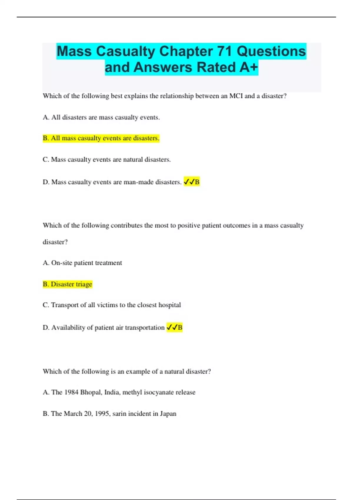 Mass Casualty Chapter 71 Questions and Answers Rated A+ Which of the following best explains the relationship between an MCI and a disaster? A. All disasters are mass casualty events. B. All mass casualty events are disasters. C. Mass casualty events are natural disasters. D. Mass casualty events are man-made disasters. B Which of the following contributes the most to positive patient outcomes in a mass casualty disaster? A. On-site patient treatment B. Disaster triage C. Transport of all victims to the closest hospital D. Availability of patient air transportation B Which of the following is an example of a natural disaster? A. The 1984 Bhopal, India, methyl isocyanate release B. The March 20, 1995, sarin incident in Japan C. The 2007 Virginia Tech campus shootings D. The 2011 earthquake in Japan D Several patients present to the triage nurse in an ED. They are complaining of skin redness, itching, vomiting, and diarrhea. What does the nurse suspect the patients have been exposed to? A. Radiation B. Chemical agents C. Influenza D. Biotoxin agent A An ICS is set up at the scene of a disaster. Who has the responsibility for keeping ahead of the disaster by evaluating the status of the resources and determining future resource needs? A. Incident commander B. Planning chief C. Operations chief D. Logistics chief B Which of the following contributes to a successful hospital disaster response? A. Aggressive resuscitation efforts for patients without a pulse B. Immediate response for patients as soon as they arrive at the ED C. Appropriate PPE to protect staff from contamination D. Decontamination area located within the ED C Which of the following items is an essential component of your personal disaster plan? A. Water B. Fresh fruit C. Reading material D. Hazard flares A Disaster public warning information should include what information? 1. Instructions for evacuation 2. Shelter-in-place instructions