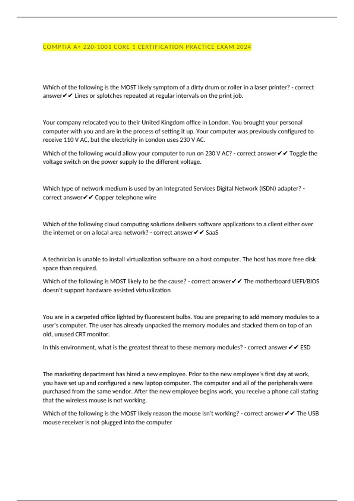 COMPTIA A+ 220-1001 CORE 1 CERTIFICATION PRACTICE EXAM 2024 Which of the following is the MOST likely symptom of a dirty drum or roller in a laser printer? - correct answer Lines or splotches repeated at regular intervals on the print job. Your company relocated you to their United Kingdom office in London. You brought your personal computer with you and are in the process of setting it up. Your computer was previously configured to receive 110 V AC, but the electricity in London uses 230 V AC. Which of the following would allow your computer to run on 230 V AC? - correct answer Toggle the voltage switch on the power supply to the different voltage. Which type of network medium is used by an Integrated Services Digital Network (ISDN) adapter? - correct answer Copper telephone wire Which of the following cloud computing solutions delivers software applications to a client either over the internet or on a local area network? - correct answer SaaS A technician is unable to install virtualization software on a host computer. The host has more free disk space than required. Which of the following is MOST likely to be the cause? - correct answer The motherboard UEFI/BIOS doesn't support hardware assisted virtualization You are in a carpeted office lighted by fluorescent bulbs. You are preparing to add memory modules to a