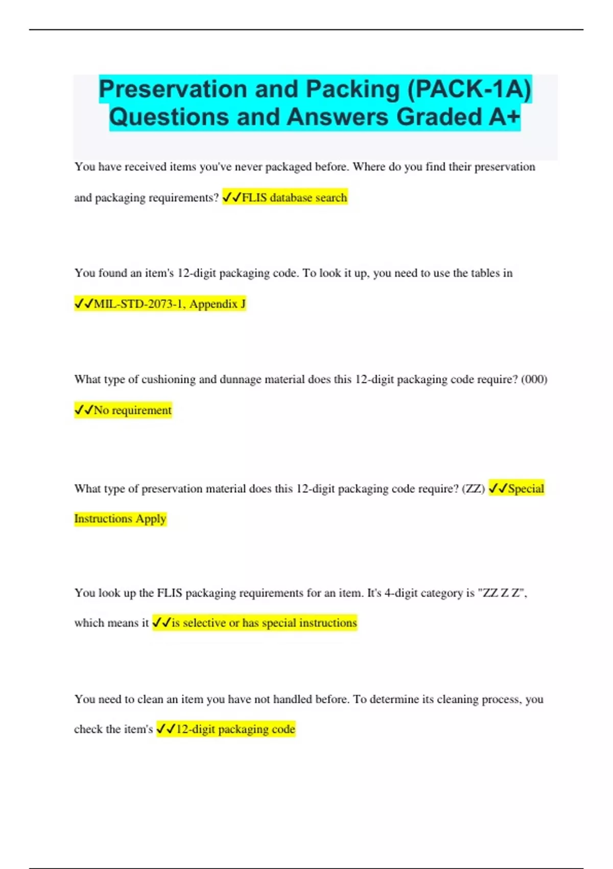 Preservation and Packing (PACK -1A) Questions and Answers Graded A+ You h ave received items you've never packaged before. Where do you find their preservation and packaging requirements? ✔✔FLIS database search You found an item's 12 -digit packaging code. To look it up, you need to use the tables in ✔✔MIL-STD -2073 -1, Appendix J What type of cushioning and dunnage material does this 12 -digit packaging code require? (000) ✔✔No requirement What type of preservatio n material does this 12 -digit packaging code require? (ZZ) ✔✔Special Instructions Apply You look up the FLIS packaging requirements for an item. It's 4 -digit category is "ZZ Z Z", which means it ✔✔is selective or has special instructions You need to clea n an item you have not handled before. To determine its cleaning process, you check the item's ✔✔12-digit packaging code An item has a cleaning code "1". What does that mean? ✔✔You decide the best way to clean the item without injuring the item. Which st atement is NOT a basic cleaning and drying requirement? ✔✔Avoid manually drying items. To decide the best cleaning process (or processes) for an item, you should consider the ✔✔type of contaminant(s) and the item's characteristics. An item requires immed iate, heat -based drying. Using the approved drying process, you can either put the item under an infrared lamp or ✔✔put it in a heated air oven Which of the approved processes DO NOT use heat? ✔✔Allowing the item to drip -dry in a drainer - Wiping the item dry with the lint -free cloths - Blowing off moisture with compressed air Which publication defines item preservation requirements for military items? ✔✔MIL-STD -