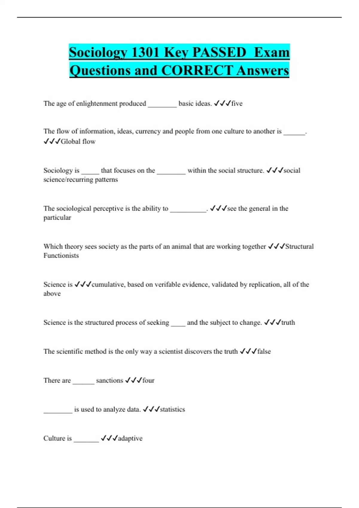 Sociology 1301 Key PASSED Exam Questions and CORRECT Answers