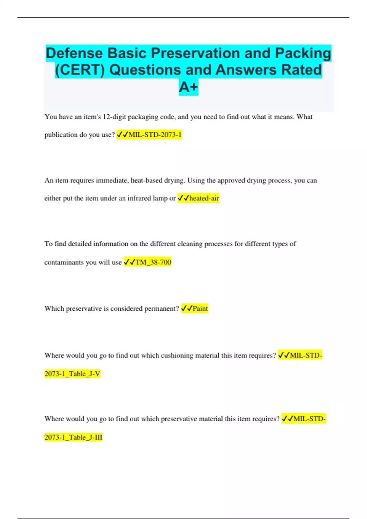 Defense Basic Preservation and Packing (CERT) Questions and Answers Rated A+