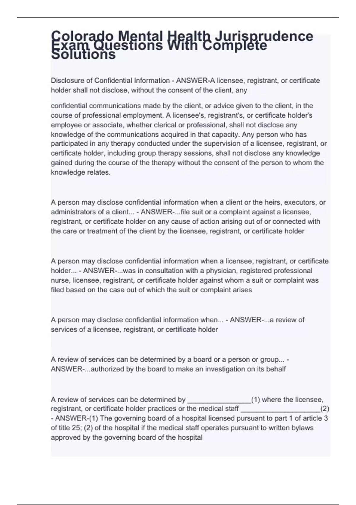 Colorado Mental Health Jurisprudence Exam Questions With Complete Solutions