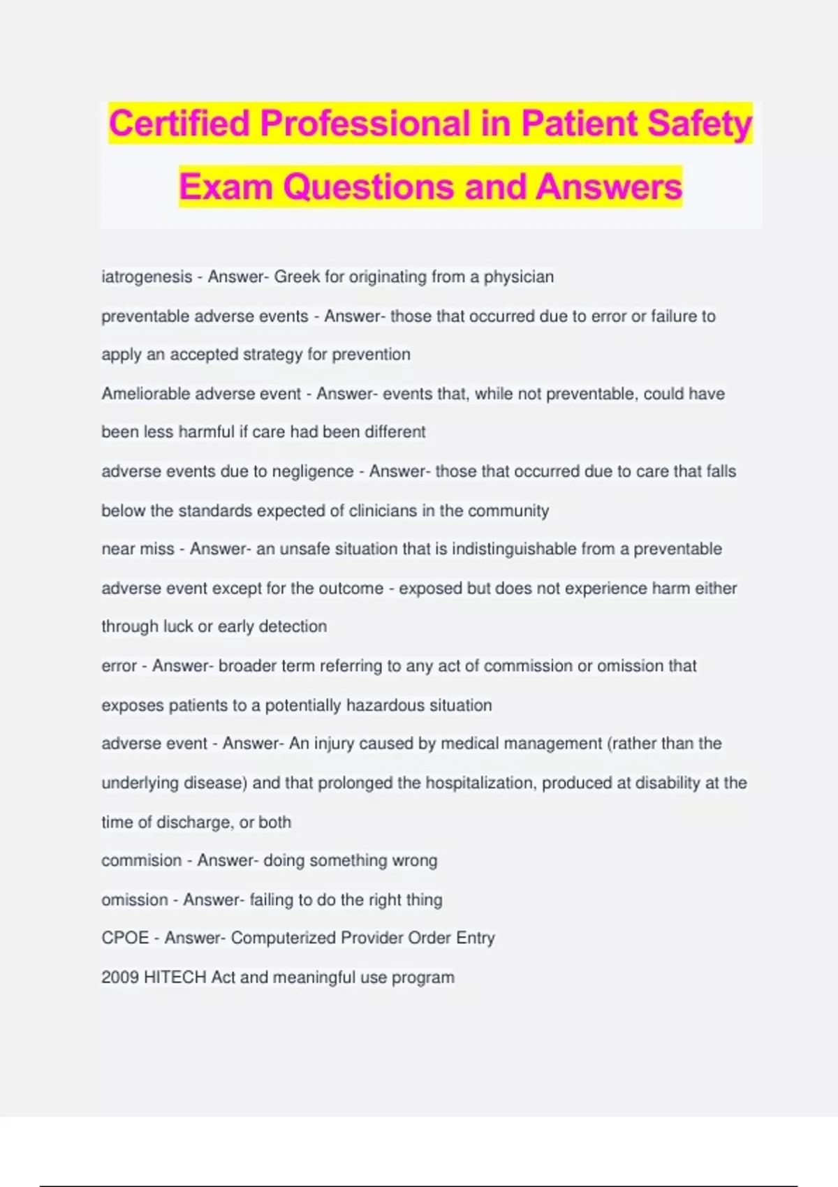 Certified Professional in Patient Safety Exam Questions and Answers iatrogenesis - Answer- Greek for originating from a physician preventable adverse events - Answer- those that occurred due to error or failure to apply an accepted strategy for prevention Ameliorable adverse event - Answer- events that, while not preventable, could have been less harmful if care had been different adverse events due to negligence - Answer- those that occurred due to care that falls below the standards expected of clinicians in the community near miss - Answer- an unsafe situation that is indistinguishable from a preventable adverse event except for the outcome - exposed but does not experience harm either through luck or early detection error - Answer- broader term referring to any act of commission or omission that exposes patients to a potentially hazardous situation adverse event - Answer- An injury caused by medical management (rather than the underlying disease) and that prolonged the hospitalization, produced at disability at the time of discharge, or both commision - Answer- doing something wrong omission - Answer- failing to do the right thing CPOE - Answer- Computerized Provider Order Entry 2009 HITECH Act and meaningful use program computer alerts three main findings - Answer- 1. modestly effective at best 2. alert fatigue is common 3. fatigue increases with exposure and heavier use of CPOE systems minimize alert fatigue - Answer- 1. increase alert specificity to reduce inconsequential alerts 2. tier alerts according to severity 3. make only high level/severe alerts interruptive 4. use human factors principles three concepts that influence safety in ambulatory care - Answer- 1. role of pt and caregiver behaviors 2. role of provider-pt interactions 3. role of community and health system Medical Office Survey on Pt Safety Culture - Answer- designed to assess safety culture in amb care and data is available from AHRQ Pt Engagement - Answer- 1. ed pt about their illness and medications with pt demonstrating understanding "teach back" 2. empowering to act as a safety double check checklist - Answer- Algorithmic listing of actions to be performed for a given clinical procedure designed to ensure that no matter how often performed by a given clinician, no step will be forgotten reduce risk of slips consensus of required behaviors slips - Answer- failure of schematic (autopilot) behaviors lapses in concentration, distractions, or fatigue mistake - Answer- failures in attentional behavior lack of experience or insufficient training Situational Awareness - Answer- the ability to access and track relevant to the task, comprehend the data, forecast what may happened based on the data, and formulate an appropriate plan in response situational awareness cannot be achieved without - Answer- clear and high-quality communication between all providers most common root cause of sentinel events - Answer- communication elements the affect communication - Answer- 1. rigid hierarchies 2. overtly disruptive and unprofessional behavior 3. nonverbal cues 4. interpersonal relations 5. group dynamics communication tools - Answer- read-back protocols SBAR teamwork training process for prescribing and adm meds - Answer- 1. order 2. Transcribing 3. dispensing 4. administration 90% errors occur at ordering (48%) or transcribing thus CPOE prevent CDSS - Answer- Clinical Decision Support System assist healthcare providers in the actual diagnosis and