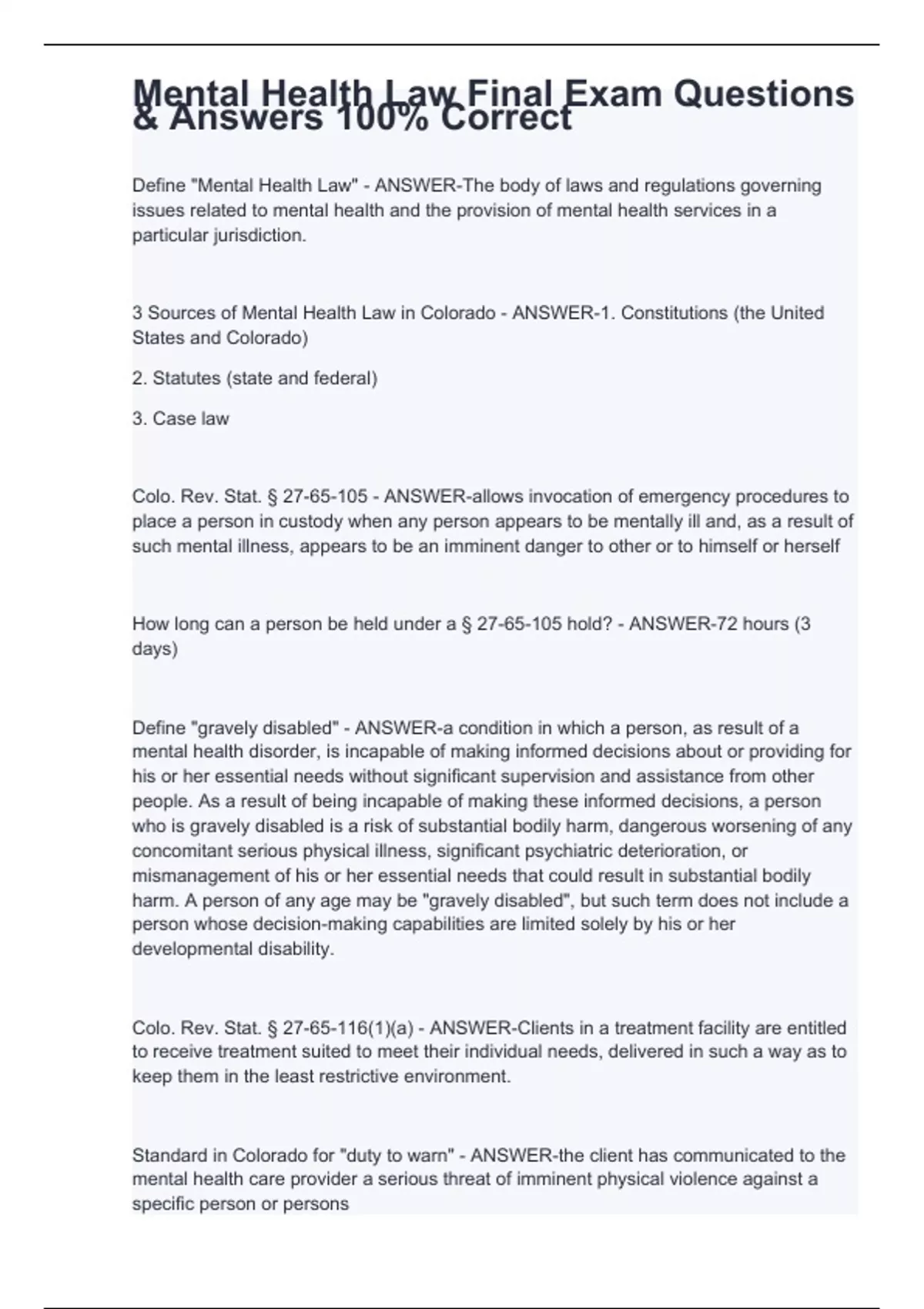 Define "Mental Health Law" - ANSWER-The body of laws and regulations governing issues related to mental health and the provision of mental health services in a particular jurisdiction. 3 Sources of Mental Health Law in Colorado - ANSWER-1. Constitutions (the United States and Colorado) 2. Statutes (state and federal) 3. Case law Colo. Rev. Stat. § 27-65-105 - ANSWER-allows invocation of emergency procedures to place a person in custody when any person appears to be mentally ill and, as a result of such mental illness, appears to be an imminent danger to other or to himself or herself How long can a person be held under a § 27-65-105 hold? - ANSWER-72 hours (3 days) Define "gravely disabled" - ANSWER-a condition in which a person, as result of a mental health disorder, is incapable of making informed decisions about or providing for his or her essential needs without significant supervision and assistance from other people. As a result of being incapable of making these informed decisions, a person who is gravely disabled is a risk of substantial bodily harm, dangerous worsening of any concomitant serious physical illness, significant psychiatric deterioration, or mismanagement of his or her essential needs that could result in substantial bodily harm. A person of any age may be "gravely disabled", but such term does not include a person whose decision-making capabilities are limited solely by his or her developmental disability. Colo. Rev. Stat. § 27-65-116(1)(a) - ANSWER-Clients in a treatment facility are entitled to receive treatment suited to meet their individual needs, delivered in such a way as to keep them in the least restrictive environment.