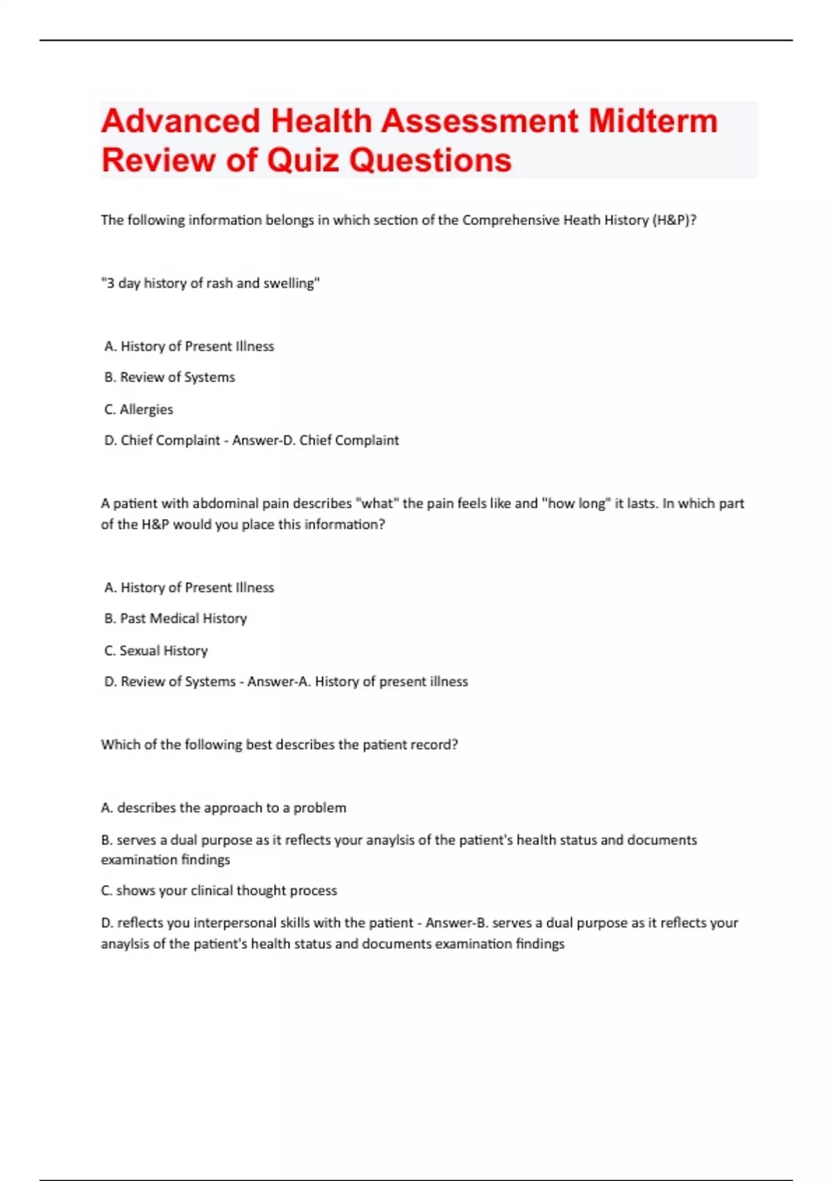The following information belongs in which section of the Comprehensive Heath History (H&P)? "3 day history of rash and swelling" A. History of Present Illness B. Review of Systems C. Allergies D. Chief Complaint - Answer-D. Chief Complaint A patient with abdominal pain describes "what" the pain feels like and "how long" it lasts. In which part of the H&P would you place this information? A. History of Present Illness B. Past Medical History C. Sexual History D. Review of Systems - Answer-A. History of present illness Which of the following best describes the patient record? A. describes the approach to a problem B. serves a dual purpose as it reflects your anaylsis of the patient's health status and documents examination findings C. shows your clinical thought process D. reflects you interpersonal skills with the patient - Answer-B. serves a dual purpose as it reflects your anaylsis of the patient's health status and documents examination findingsThe consideration of culture and ethnicity during the interview process are important because: A. similar cultures always provide similar responses B. some cultures consider certain questions and gestures offensive C. it is politically correct D. none of the above - Answer-B. some cultures consider certain questions and gestures offensive During an interview, your patient admits to feeling worthless and having a sleep disturbance for the last 3 weeks. These are clues that warrant exploration of: A. risk for suicide B. split personality C. cognitive function D. functional assessment - Answer-A. risk for suicide