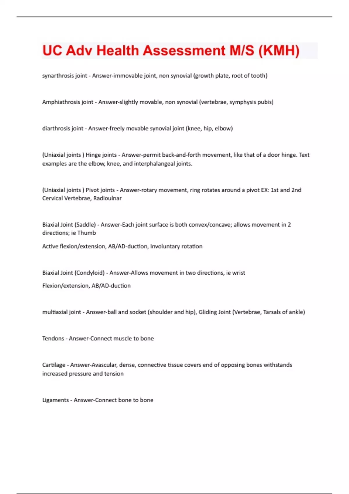 synarthrosis joint - Answer-immovable joint, non synovial (growth plate, root of tooth) Amphiathrosis joint - Answer-slightly movable, non synovial (vertebrae, symphysis pubis) diarthrosis joint - Answer-freely movable synovial joint (knee, hip, elbow) (Uniaxial joints ) Hinge joints - Answer-permit back-and-forth movement, like that of a door hinge. Text examples are the elbow, knee, and interphalangeal joints. (Uniaxial joints ) Pivot joints - Answer-rotary movement, ring rotates around a pivot EX: 1st and 2nd Cervical Vertebrae, Radioulnar Biaxial Joint (Saddle) - Answer-Each joint surface is both convex/concave; allows movement in 2 directions; ie Thumb Active flexion/extension, AB/AD-duction, Involuntary rotation Biaxial Joint (Condyloid) - Answer-Allows movement in two directions, ie wrist Flexion/extension, AB/AD-duction multiaxial joint - Answer-ball and socket (shoulder and hip), Gliding Joint (Vertebrae, Tarsals of ankle) Tendons - Answer-Connect muscle to bone Cartilage - Answer-Avascular, dense, connective tissue covers end of opposing bones withstands increased pressure and tension Ligaments - Answer-Connect bone to bonebursa - Answer-fluid-filled sac that allows for easy movement of one part of a joint over another, Cushion between surfaces Joints - Answer-Stiffness, redness, swelling and pain with motion, also can c/o pain with cold weather and rain Muscles - Answer-weakness, fatigue, aching, wasting, associated factors with exercise or sudden movement Skeletal - Answer-Gait changes, limping, numbness, tingling, crepitus, recent fractures Paget's disease of bone - Answer-Disruption of old bone tissue being replaced with new bone Dupuytren's contracture - Answer-Thickening and shrinking of the fascia of the palm with fingers being drawn into a flexed position What is a subluxation injury? - Answer-dislocation partially out of the socket What is ankylosis? - Answer-Fusion of bones across a joint Isometric - Answer-Contracts muscles at injured area without moving bones 5-Full ROM/full resistance - Answer-full ability to demonstrate full ROM of the joint when the PCP applies full pull or force in opposite direction 4-Full ROM/some resistance - Answer-PCP applies only some force in pulling or forcing in opposite direction 3-Full ROM/with gravity - Answer-No resistance applied by PCP but pt is able to have full ROM against normal gravity2-Full ROM-gravity removed - Answer-PCP must help pt move limb 1-slight contraction ROM - Answer-10% of muscle contraction 0-no contraction ROM - Answer-0% muscle contraction Indicates disability: - Answer-Muscle strength of grade 3 or less, may be r/t age or overall physical condition strain - Answer-A condition resulting from damaging a muscle or tendon, heals faster--muscle has better blood supply sprain - Answer-injury to a ligament, heals slower