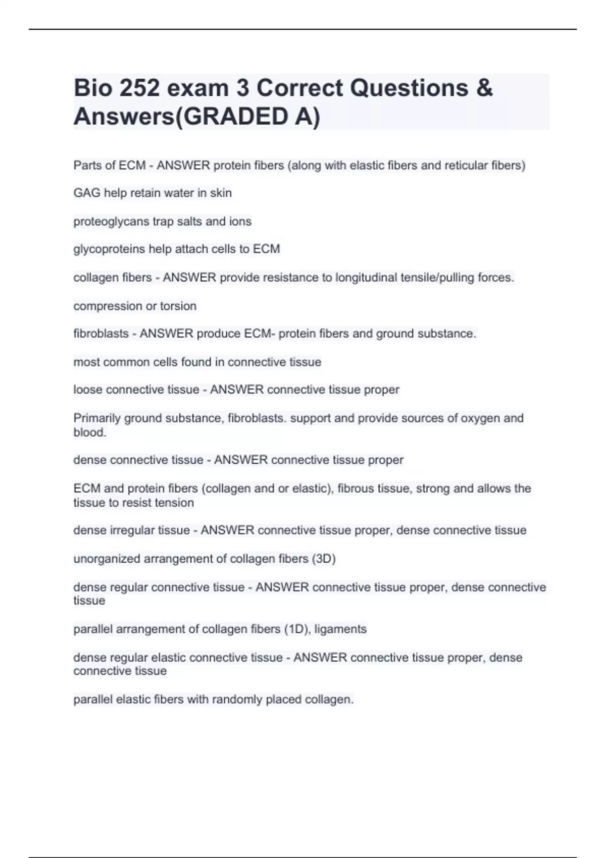 Parts of ECM - ANSWER protein fibers (along with elastic fibers and reticular fibers) GAG help retain water in skin proteoglycans trap salts and ions glycoproteins help attach cells to ECM collagen fibers - ANSWER provide resistance to longitudinal tensile/pulling forces. compression or torsion fibroblasts - ANSWER produce ECM- protein fibers and ground substance. most common cells found in connective tissue loose connective tissue - ANSWER connective tissue proper Primarily ground substance, fibroblasts. support