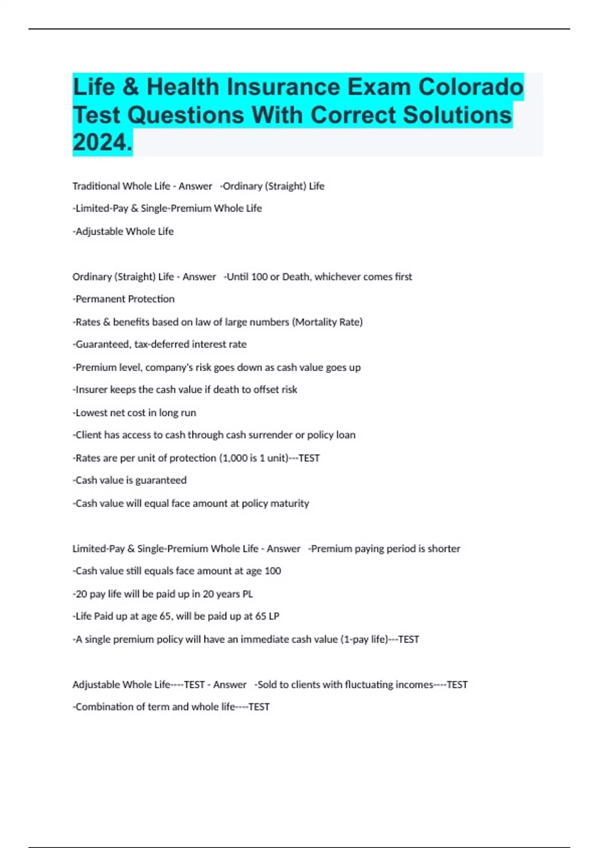 Life & Health Insurance Exam Colorado Test Questions With Correct Solutions 2024.