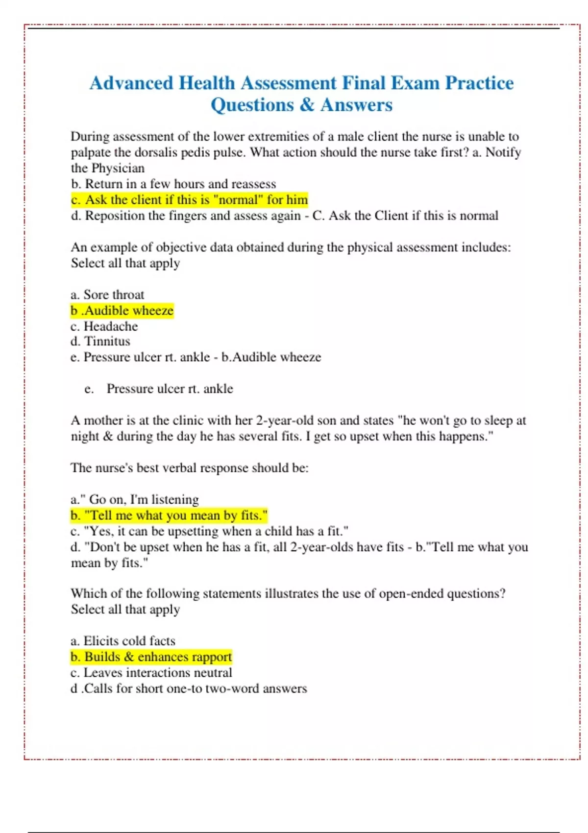 During assessment of the lower extremities of a male client the nurse is unable to palpate the dorsalis pedis pulse. What action should the nurse take first? a. Notify the Physician b. Return in a few hours and reassess c. Ask the client if this is "normal" for him d. Reposition the fingers and assess again - C. Ask the Client if this is normal An example of objective data obtained during the physical assessment includes: Select all that apply a. Sore throat b .Audible wheeze c. Headache d. Tinnitus e. Pressure ulcer rt. ankle - b.Audible wheeze e. Pressure ulcer rt. ankle A mother is at the clinic with her 2-year-old son and states "he won't go to sleep at night & during the day he has several fits. I get so upset when this happens." The nurse's best verbal response should be: a." Go on, I'm listening b. "Tell me what you mean by fits." c. "Yes, it can be upsetting when a child has a fit." d. "Don't be upset when he has a fit, all 2-year-olds have fits - b."Tell me what you mean by fits." Which of the following statements illustrates the use of open-ended questions? Select all that apply a. Elicits cold facts b. Builds & enhances rapport c. Leaves interactions neutral d .Calls for short one-to two-word answers