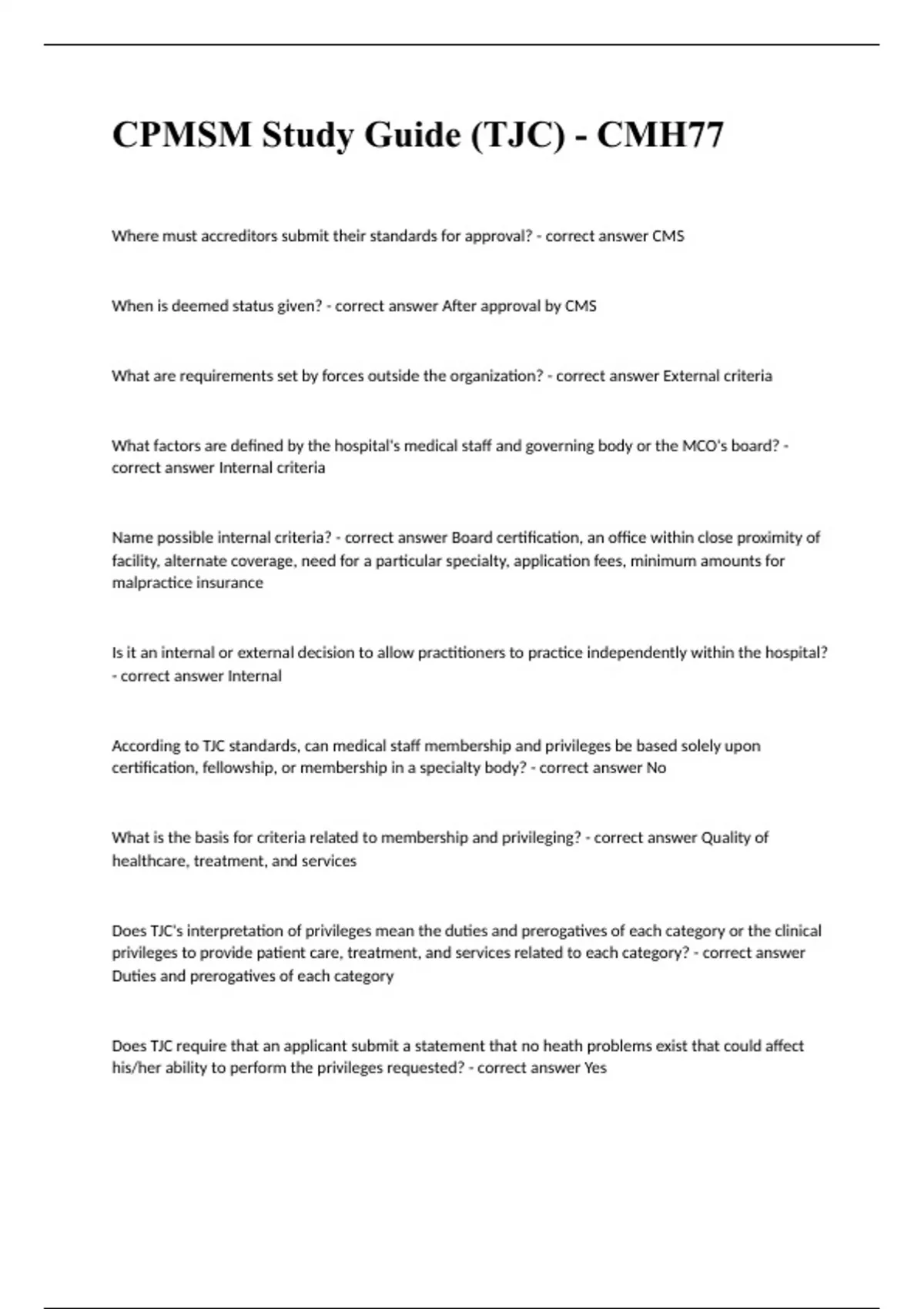 CPMSM Study Guide (TJC) - CMH77 QUESTIONS AND ANSWERS VERIFIED 2024