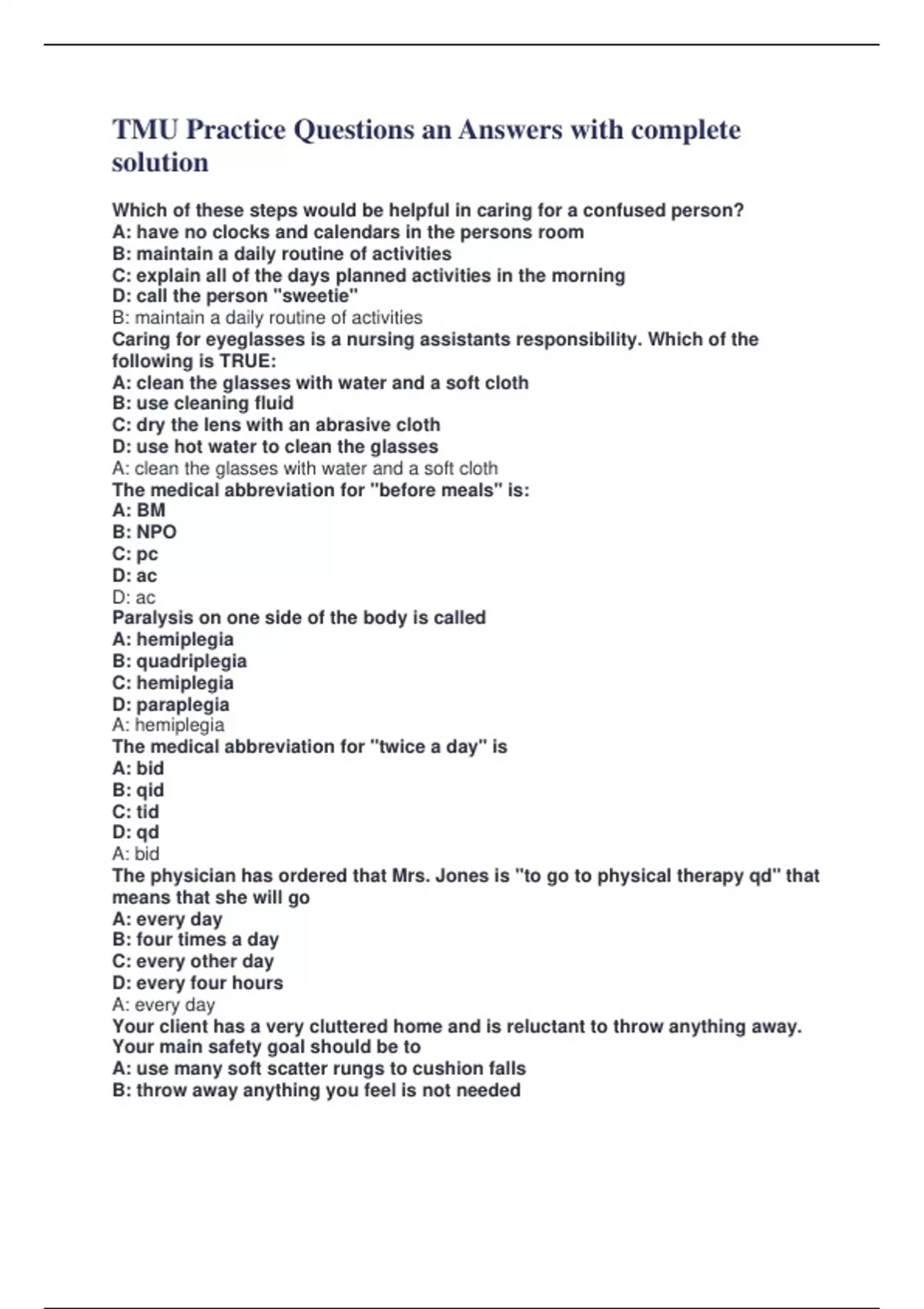 TMU Practice Questions an Answers with complete solution Which of these steps would be helpful in caring for a confused person? A: have no clocks and calendars in the persons room B: maintain a daily routine of activities C: explain all of the days planned activities in the morning D: call the person "sweetie" B: maintain a daily routine of activities Caring for eyeglasses is a nursing assistants responsibility. Which of the following is TRUE: A: clean the glasses with water and a soft cloth B: use cleaning fluid C: dry the lens with an abrasive cloth D: use hot water to clean the glasses A: clean the glasses with water and a soft cloth The medical abbreviation for "before meals" is: A: BM B: NPO C: pc D: ac D: ac Paralysis on one side of the body is called A: hemiplegia B: quadriplegia C: hemiplegia D: paraplegia A: hemiplegia The medical abbreviation for "twice a day" is A: bid B: qid C: tid D: qd A: bid The physician has ordered that Mrs. Jones is "to go to physical therapy qd" that means that she will go A: every day B: four times a day C: every other day D: every four hours A: every day Your client has a very cluttered home and is reluctant to throw anything away. Your main safety goal should be to A: use many soft scatter rungs to cushion falls B: throw away anything you feel is not needed