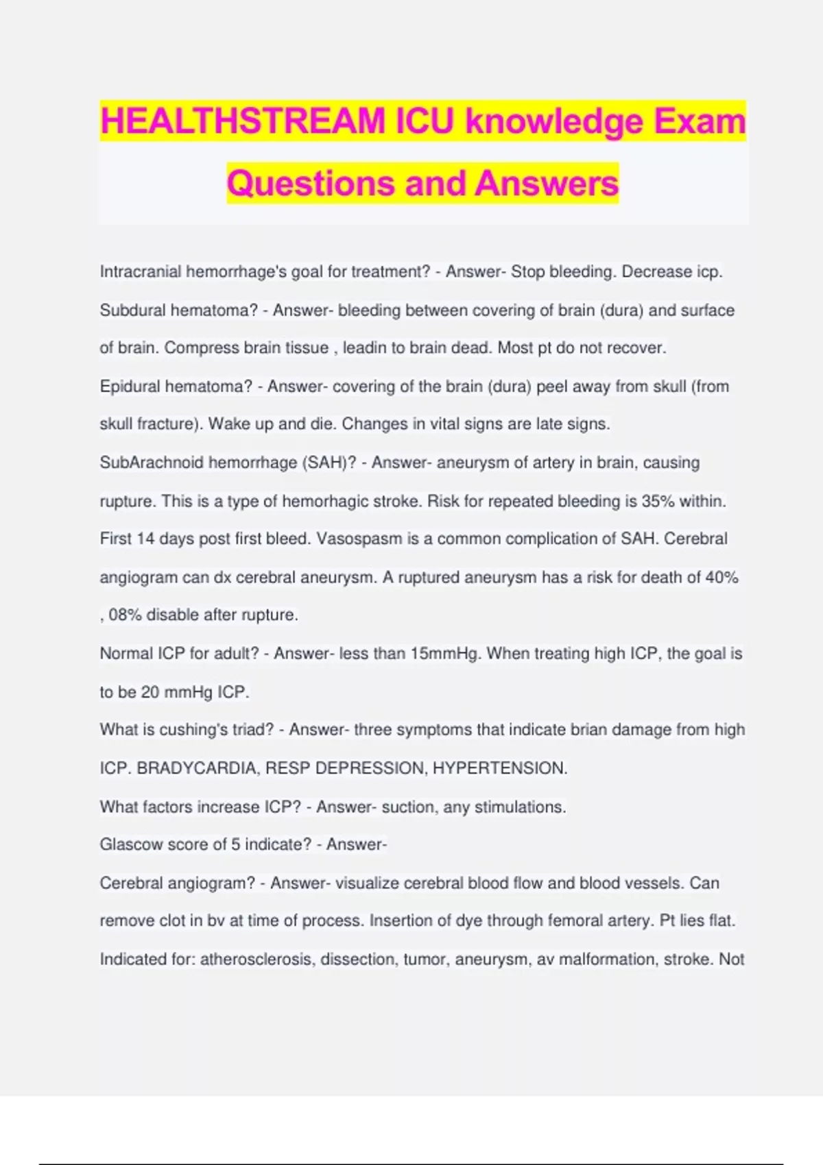 HEALTHSTREAM ICU knowledge Exam Questions and Answers Intracranial hemorrhage's goal for treatment? - Answer- Stop bleeding. Decrease icp. Subdural hematoma? - Answer- bleeding between covering of brain (dura) and surface of brain. Compress brain tissue , leadin to brain dead. Most pt do not recover. Epidural hematoma? - Answer- covering of the brain (dura) peel away from skull (from skull fracture). Wake up and die. Changes in vital signs are late signs. SubArachnoid hemorrhage (SAH)? - Answer- aneurysm of artery in brain, causing rupture. This is a type of hemorhagic stroke. Risk for repeated bleeding is 35% within. First 14 days post first bleed. Vasospasm is a common complication of SAH. Cerebral angiogram can dx cerebral aneurysm. A ruptured aneurysm has a risk for death of 40% , 08% disable after rupture. Normal ICP for adult? - Answer- less than 15mmHg. When treating high ICP, the goal is to be 20 mmHg ICP. What is cushing's triad? - Answer- three symptoms that indicate brian damage from high ICP. BRADYCARDIA, RESP DEPRESSION, HYPERTENSION. What factors increase ICP? - Answer- suction, any stimulations. Glascow score of 5 indicate? - Answer- Cerebral angiogram? - Answer- visualize cerebral blood flow and blood vessels. Can remove clot in bv at time of process. Insertion of dye through femoral artery. Pt lies flat. Indicated for: atherosclerosis, dissection, tumor, aneurysm, av malformation, stroke. Not for kidney failure, bleeding issue, allergic to dye (iodine& shellfish). Cerebral angiogram can dx cerebral aneurysm. A ruptured aneurysm has a risk for death of 40% , 08% disable after rupture. Av malformation? - Answer- l connection between artery and vein without capillary bed between in brain blood vessels. Leading to high pressure in veins (as vein is receiving blood too quick!-> weaken bv-> risk aneurysm.