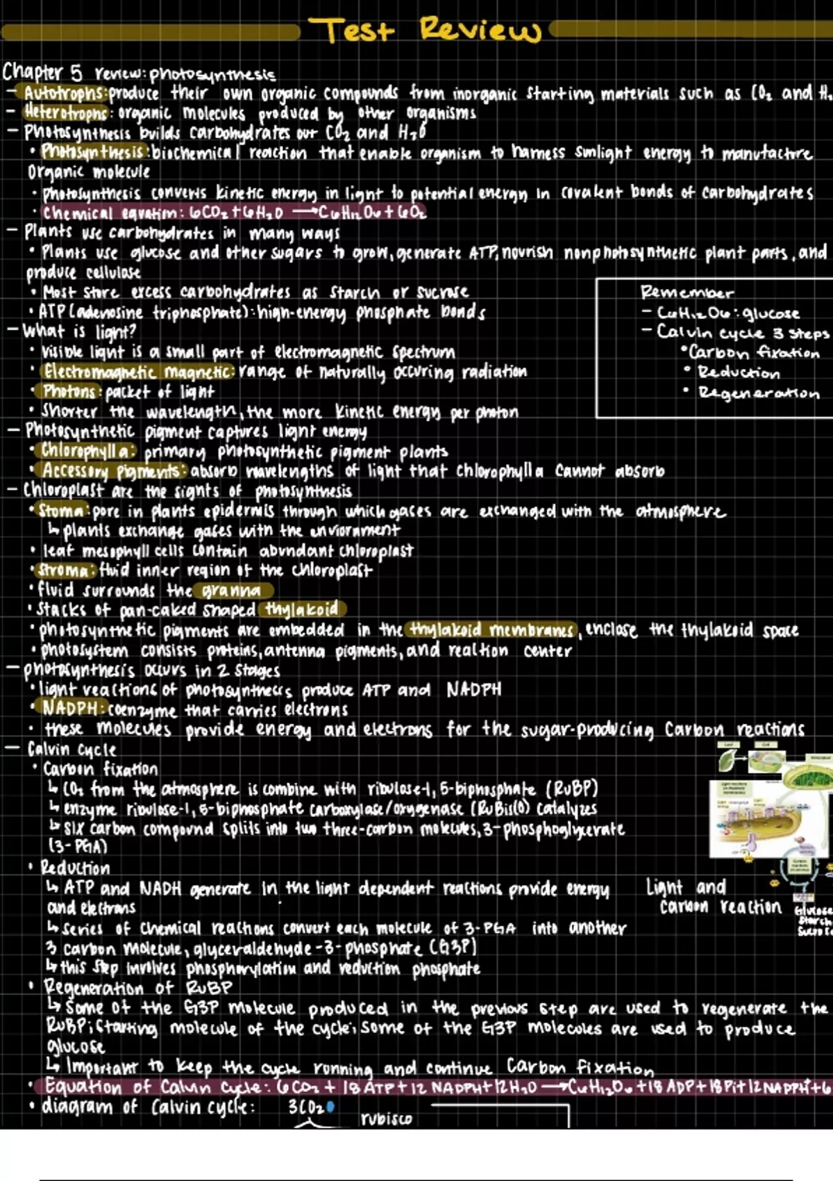 Test review for chapter 5-8. Has diagrams of the glycolysis, Kreb cycle, and the Calvin Cycle, has the definition word highlighted (yellow), key words (pink)