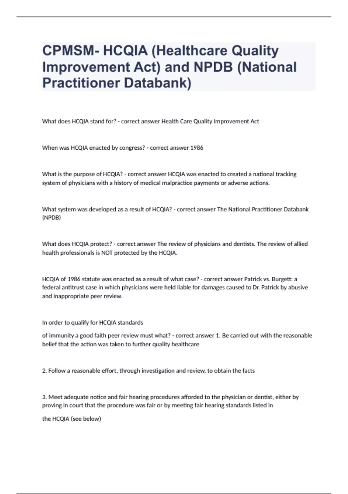 CPMSM- HCQIA (Healthcare Quality Improvement Act) and NPDB (National Practitioner Databank questions and answers verified 2024