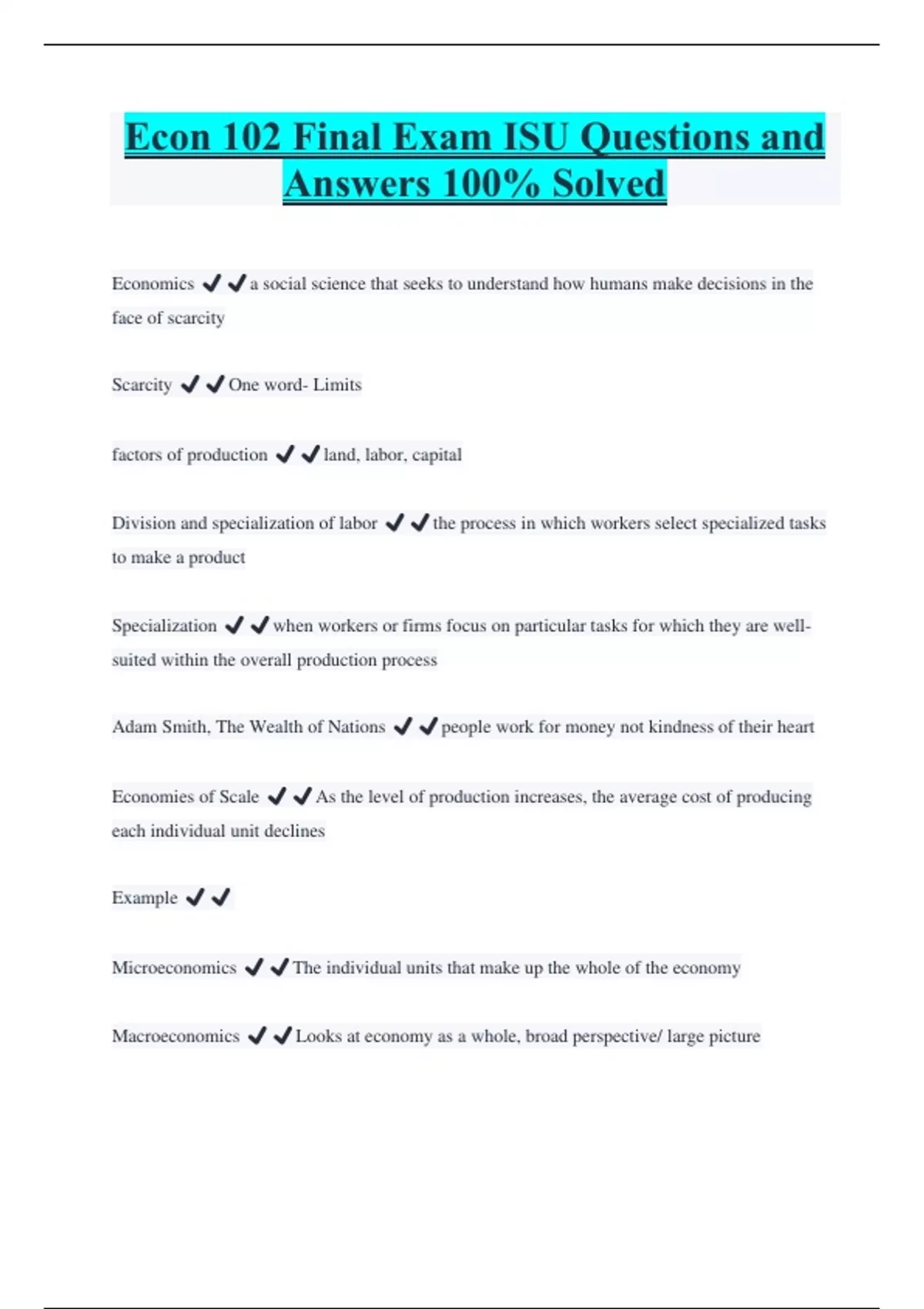 Econ 102 Final Exam ISU Questions and Answers 100% Solved Economics ️️a social science that seeks to understand how humans make decisions in the face of scarcity Scarcity ️️One word- Limits factors of production ️️land, labor, capital Division and specialization of labor ️️the process in which workers select specialized tasks to make a product Specialization ️️when workers or firms focus on particular tasks for which they are wellsuited within the overall production process Adam Smith, The Wealth of Nations ️️people work for money not kindness of their heart Economies of Scale ️️As the level of production increases, the average cost of producing each individual unit declines Example ️