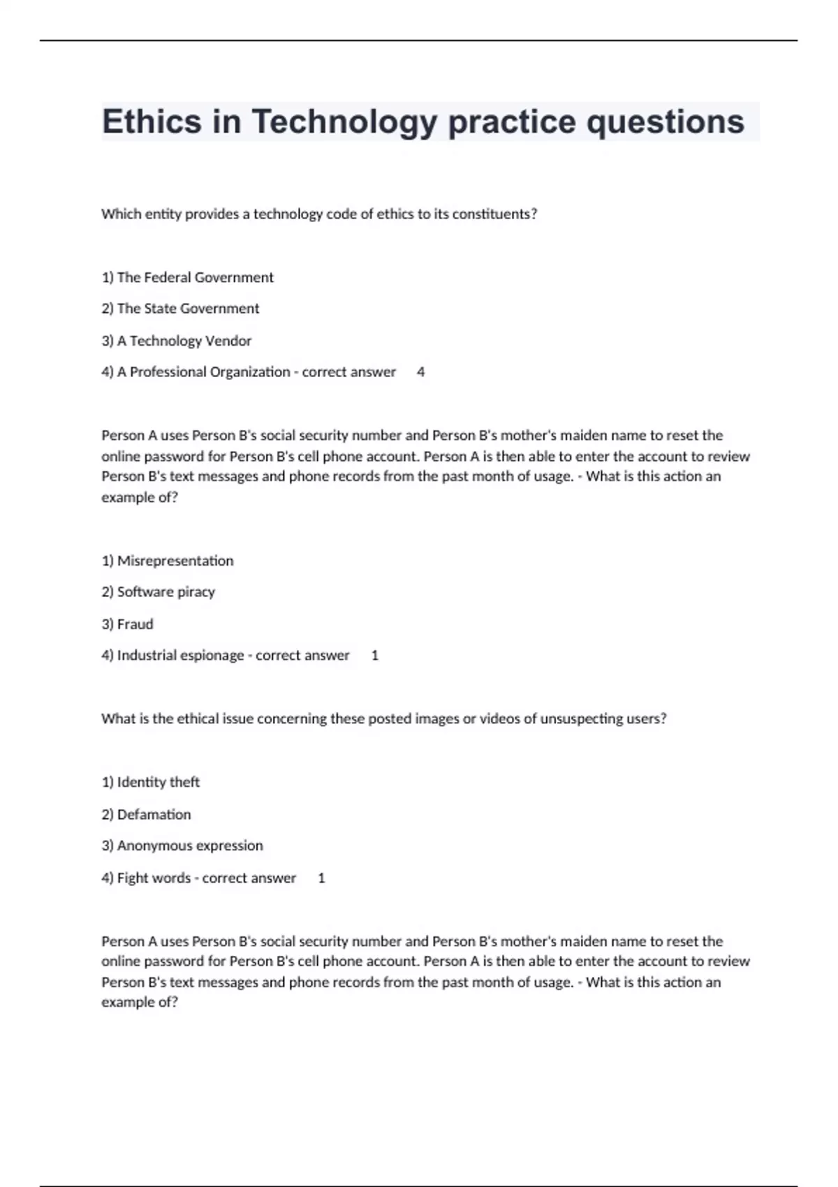 Which entity provides a technology code of ethics to its constituents? 1) The Federal Government 2) The State Government 3) A Technology Vendor 4) A Professional Organization - correct answer 4 Person A uses Person B's social security number and Person B's mother's maiden name to reset the online password for Person B's cell phone account. Person A is then able to enter the account to review Person B's text messages and phone records from the past month of usage. - What is this action an example of? 1) Misrepresentation 2) Software piracy 3) Fraud 4) Industrial espionage - correct answer 1 What is the ethical issue concerning these posted images or videos of unsuspecting users? 1) Identity theft 2) Defamation 3) Anonymous expression 4) Fight words - correct answer 1 Person A uses Person B's social security number and Person B's mother's maiden name to reset the online password for Person B's cell phone account. Person A is then able to enter the account to review Person B's text messages and phone records from the past month of usage. - What is this action an example of? Misrepresentation Software piracy Fraud Industrial espionage - correct answer Three years after this student graduates, she invites friends and business leaders to the launch of her startup. Halfway through the celebration, her two friends from school realize she implemented the business plan without asking them for permission or inviting them to be partners. She offers to pay them a set amount to walk away. - What are two ethical violations made by this business owner? 1) Bribery 2) Fraud 3) Piracy 4) Breach of Contract - correct answer 1 & 4 Which regulation is relevant to this video game company's actions with the children users? 1) Children's Online Privacy Protection Act (COPPA) 2) Children and Young Persons Act 1933 3) Omnibus Crime Control and Safe Streets Act 4) The First Amendment - correct answer 1 Which organization would offer more comprehensive training programs to support caregivers? 1) Centers for Medicare & Medicaid Services (CMS) 2) Food and Drug Administration (FDA) 3) National Patient Safety Foundation (NPSF) 4) Association Society of Health‐System Pharmacists (ASHP) - correct answer 1 Three years after this student graduates, she invites friends and business leaders to the launch of her startup. Halfway through the celebration, her two friends from school realize she implemented the business plan without asking them for permission or inviting them to be partners. She offers to pay them a set amount to walk away. How should the actions of this business owner be described? 1) Illegal but ethical 2) Illegal and unethical 3) Legal and ethical 4) Legal but unethical - correct answer 2 An IT professional traveling for a work assignment decides to take a detour for personal business, and due to excessive speed, causes an auto accident. Who is responsible for damages? 1) IT workers who breach the duty of care are accountable for injuries. 2) The company owns the vehicle and is, thus, liable for negligence. 3) Determination of liability is the responsibility of the police. 4) Both the IT professional and the business must make reparations - correct answer 1 What is a description of the threat to the customer data? 1) Unintended release of sensitive data or the access of sensitive data by authorized individuals 2) Intended release of sensitive data or the access of sensitive data by authorized individuals 3) Unintended release of sensitive data or the access of sensitive data by unauthorized individuals 4) Intended release of sensitive data or the access of sensitive data by unauthorized individuals - correct answer 2