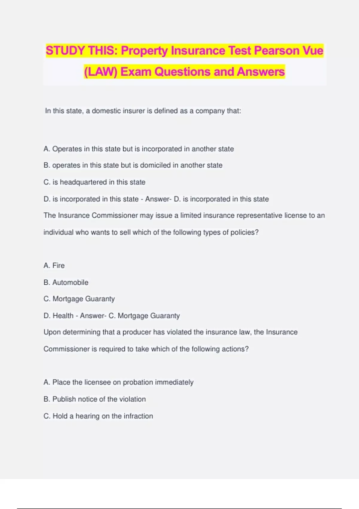 STUDY THIS: Property Insurance Test Pearson Vue (LAW) Exam Questions and Answers
