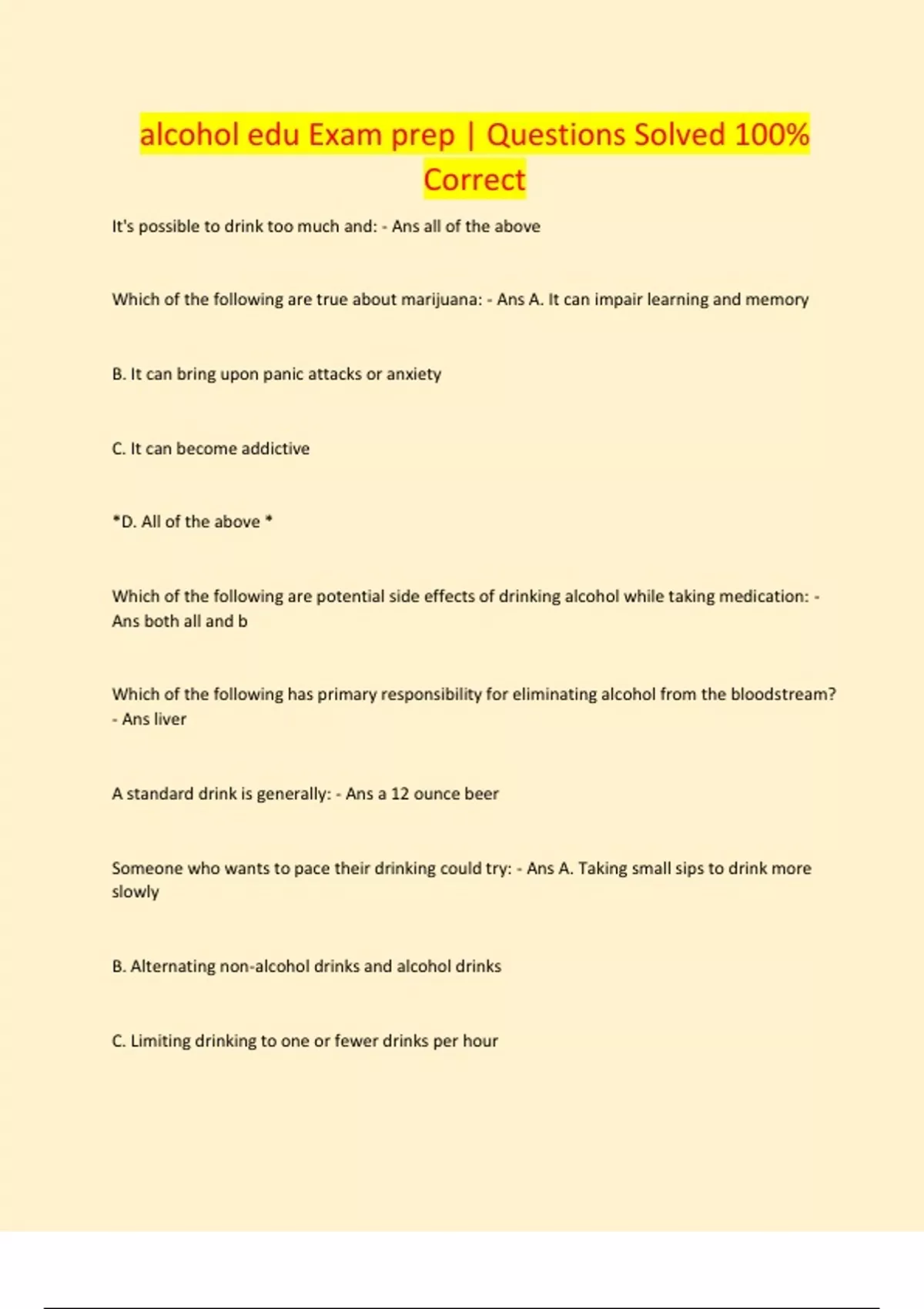 alcohol edu Exam prep | Questions Solved 100% Correct