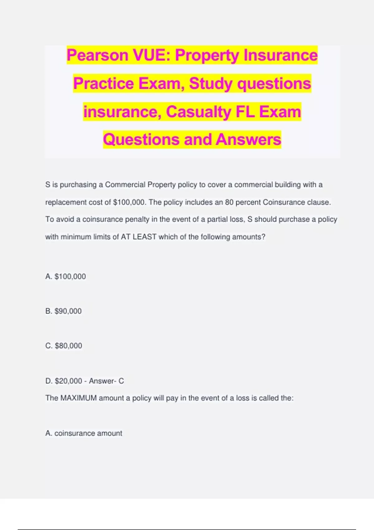 Pearson VUE: Property Insurance Practice Exam, Study questions insurance, Casualty FL Exam Questions and Answers