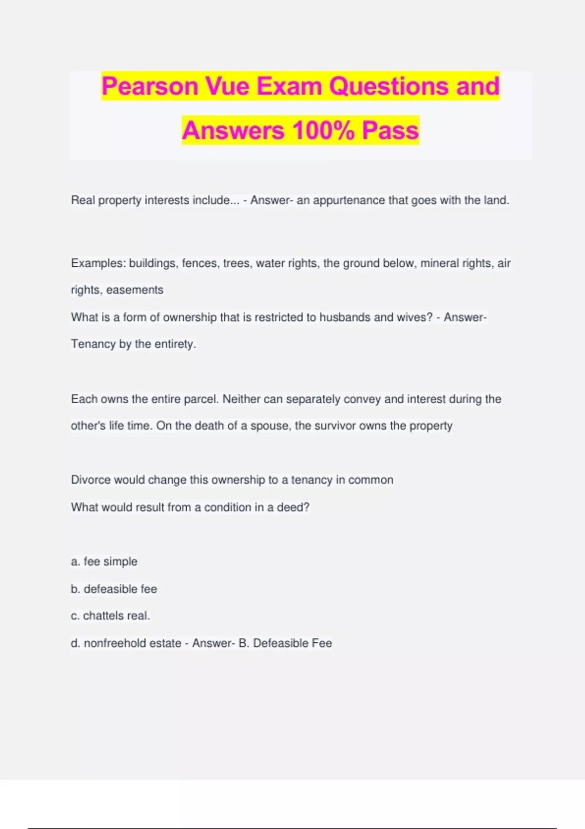 Pearson Vue Exam Questions and Answers 100% Pass Real property interests include... - Answer- an appurtenance that goes with the land. Examples: buildings, fences, trees, water rights, the ground below, mineral rights, air rights, easements What is a form of ownership that is restricted to husbands and wives? - Answer- Tenancy by the entirety. Each owns the entire parcel. Neither can separately convey and interest during the other's life time. On the death of a spouse, the survivor owns the property Divorce would change this ownership to a tenancy in common What would result from a condition in a deed? a. fee simple b. defeasible fee c. chattels real. d. nonfreehold estate - Answer- B. Defeasible Fee Fee simple determinable is a defeasible estate that could be lost lost upon the happening of a specified condition. If a deed specifies that a grant shall be only "for as long as"; or while a property is in a particular use, the length of the estate is really determined by the deed J installed central air-conditioning in his home. the compressor unit, which was located outside the home, would be regarded as what? - Answer- Real property an investor's personal assets could be subject to a creditor's claim in a... - Answer- General Partnership An active partner and has unlimited personal liability for the debts of the partnership. One general partner can personally obligate the other general partners (Part of Tenancy in Partnership) How does an S corporation differ from other corporations? - Answer- Its investors have no personal liability A tenant in a commercial building installed a large sign that was anchored to the building with steel rods. Which term properly describes the sign? A.Fixture B. Trade fixture C. Real Property D. Emblement - Answer- B. Trade Fixture Installed by a tenant for the purpose of conducting a business or trade. A tenant can remove a trade fixture but is liable for removal damage to real property . What type of real property description would include reference to an iron stake? - Answer- Metes and bounds (aka measurements and directions) Shows the boundaries of parcel by measuring from point to point. The measuring points in a metes-and-bounds description are known as monuments. Two types of monuments: -natural monuments: tress, rocks, rivers -artificial monuments: iron stakes, fences, roads A tenancy in common differs from a joint tenancy in that... - Answer- tenants in common may have unequal interests Chattels real differ from appurtenances in that they - Answer- Are personal property The definition of chattel refers to all personal property (things you own other than real estate). An example of chattel is your furniture and car. Rights, benefits, and improvements that go with the land are known as - Answer- Appurtenances which would be classified as real property? A. Trade Fixtures B. Chattels Real C. Water rights D. Mortgages - Answer- C. Water Rights What are three of the tests of a fixture? - Answer- 1. Adaptability: Legal rather than a physical attachment. If an item is reasonably necessary for the normal use of the property, it probably is a fixture, even though it is not attached