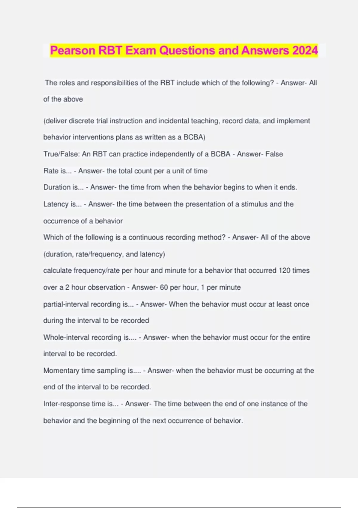 Pearson RBT Exam Questions and Answers 2024 The roles and responsibilities of the RBT include which of the following? - Answer- All of the above (deliver discrete trial instruction and incidental teaching, record data, and implement behavior interventions plans as written as a BCBA) True/False: An RBT can practice independently of a BCBA - Answer- False Rate is... - Answer- the total count per a unit of time Duration is... - Answer- the time from when the behavior begins to when it ends. Latency is... - Answer- the time between the presentation of a stimulus and the occurrence of a behavior Which of the following is a continuous recording method? - Answer- All of the above (duration, rate/frequency, and latency) calculate frequency/rate per hour and minute for a behavior that occurred 120 times over a 2 hour observation - Answer- 60 per hour, 1 per minute partial-interval recording is... - Answer- When the behavior must occur at least once during the interval to be recorded Whole-interval recording is.... - Answer- when the behavior must occur for the entire interval to be recorded. Momentary time sampling is.... - Answer- when the behavior must be occurring at the end of the interval to be recorded. Inter-response time is... - Answer- The time between the end of one instance of the behavior and the beginning of the next occurrence of behavior. which recording method would you expect to use when a target behavior is set to increase? - Answer- whole-interval recording Which recording method would you expect to use when a target behavior is set to decrease? - Answer- Partial-interval recording true or false? Partial interval recording has the tendency to under-estimate the frequency of a target behavior while whole interval recording has the tendency to over- estimate the frequency of the target behavior? - Answer- False Which of the following are examples of "permanent products" that can be used to collect data using permanent product recording procedures. - Answer- Number of broken windows and folded shirts True/False: permanent product recording is one of the lease cumbersome data recording methods - Answer- True Choose the best operational definition for a tantrum - Answer- Any instance of the client crying and hitting himself in the head with a closed fist which makes a sound that can be heard within five feet. Instance must last longer than 30 seconds and are separated by 30 seconds of non-occurrence. Define behavior: - Answer- The activity of living organisms; human behavior includes everything that people do. define environment: - Answer- the conglomerate of real circumstances in which the organism or references part of the organism exists; behavior cannot occur in the absence of environment. List the four functions of behavior: - Answer- Social positive (attention/access), Social negative (escaping), Automatic Positive (sensory stimulation), Automatic Negative (pain attenuation) A client gets out of his seat every time a demand is placed. When he gets out of his seat his teacher says, "Oh you need a break", and does not follow through with her demand. This client's out of seat behavior most likely serves what function? - Answer- Social negative (escape) A client frequently spits. You notice that he spits during work times, when he is on a break, when he is playing with his favorite toys, during meal times, when you or someone else is directly engaged with him, and even when he is by himself. One day mom brings the client back from the dentist where he had to get 6 cavities filled. After this dentist appointment the spitting stopped. What function does spitting most likely serve? - Answer- Automatic negative (pain attenuation) Every time his mother removes items from him, a client engages in a tantrum. Mom tries to ignore him but after around five minutes mom gives him back the item she removed and the tantrum immediately stops. What function is most likely maintaining the tantrums? - Answer- Social Positive (attention/access) A client hits other students in his class during work and break times. Each time he hits another students the teacher immediately provides a verbal reprimand. What function does his hitting most like serve? - Answer- Social Positive (attention/access) You work with a client who drops legos on the floor for hours if left alone. The client does this even if others are playing with him, when no demands are being placed, and when given free access to a number of preferred toys. What is the function of the lego dropping behavior? - Answer- Automatic Positive (sensory stimulation) What is an antecedent? - Answer- A stimulus that occurs before the behavior What is a consequence? - Answer- A stimulus that occurs after the behavior Why do we conduct assessments? - Answer- All of the above (to discover behavioral deficits, to discover behavior excesses, to identify environment variables) True/False: A functional assessment is a set of procedures used to identify the cause of a problem behavior or socially inappropriate behavior. - Answer- True