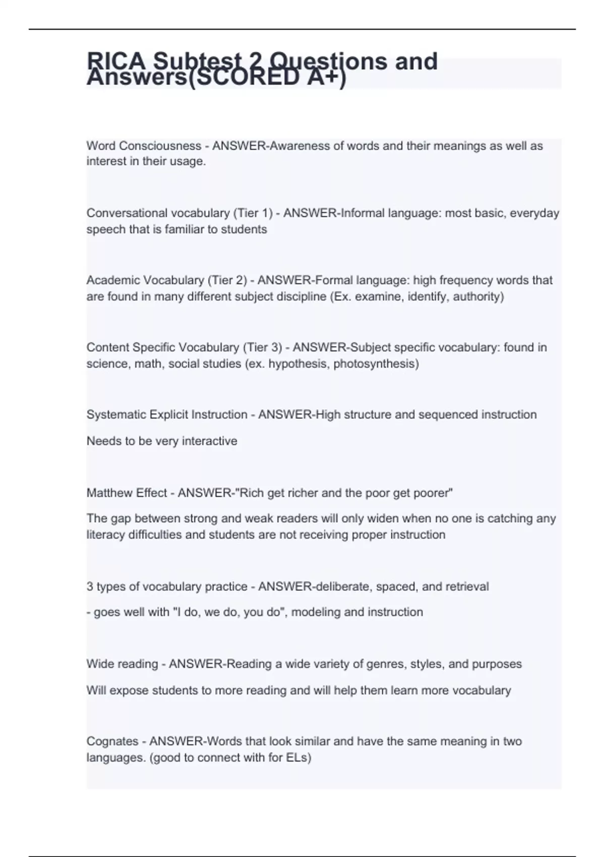 Conversational vocabulary (Tier 1) - ANSWER-Informal language: most basic, everyday speech that is familiar to students Academic Vocabulary (Tier 2) - ANSWER-Formal language: high frequency words that are found in many different subject discipline (Ex. examine, identify, authority) Content Specific Vocabulary (Tier 3) - ANSWER-Subject specific vocabulary: found in science, math, social studies (ex. hypothesis, photosynthesis) Systematic Explicit Instruction - ANSWER-High structure and sequenced instruction Needs to be very interactive Matthew Effect - ANSWER-"Rich get richer and the poor get poorer" The gap between strong and weak readers will only widen when no one is catching any literacy difficulties and students are not receiving proper instruction 3 types of vocabulary practice - ANSWER-deliberate, spaced, and retrieval - goes well with "I do, we do, you do", modeling and instruction Wide reading - ANSWER-Reading a wide variety of genres, styles, and purposes Will expose students to more reading and will help them learn more vocabulary