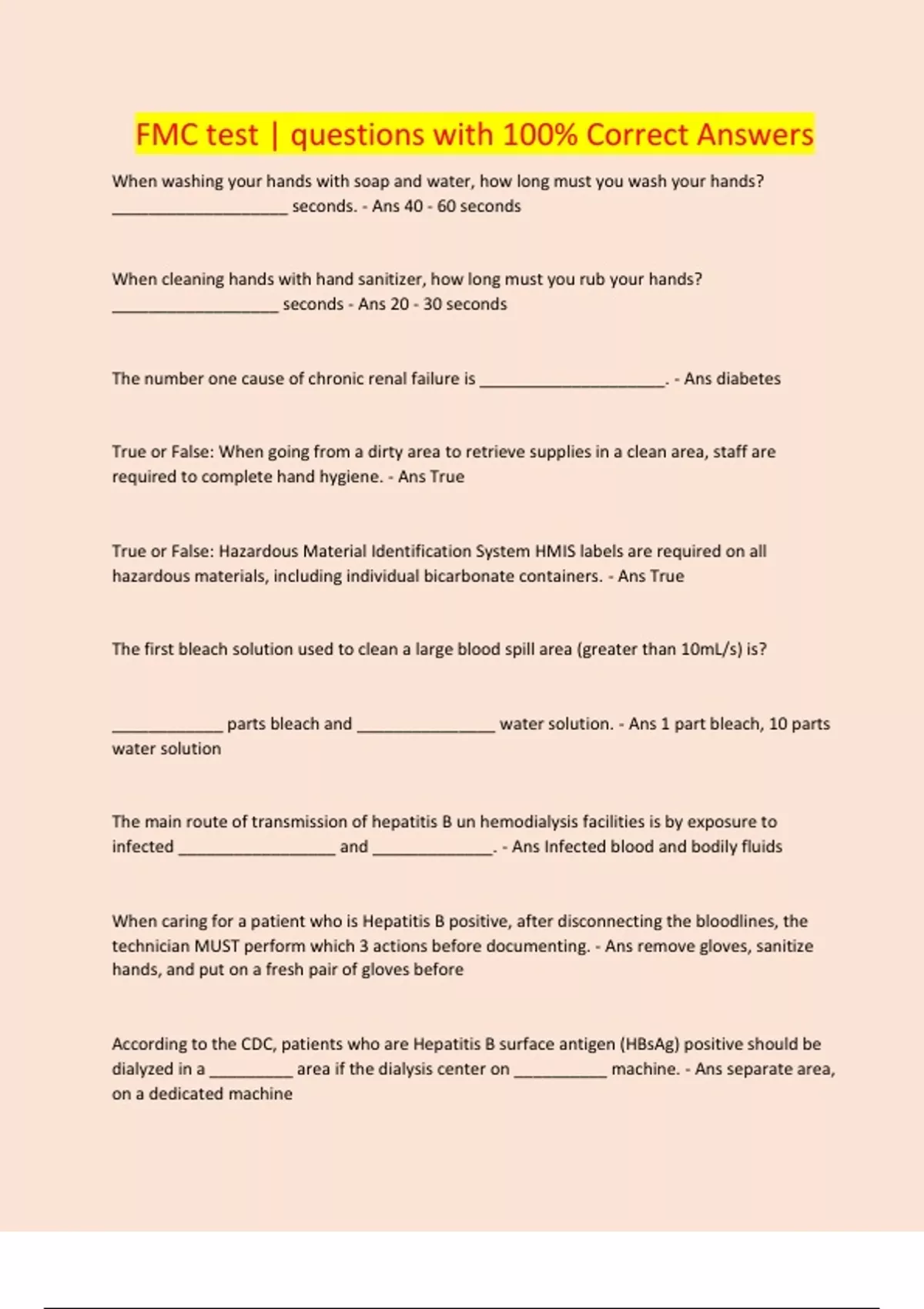 When washing your hands with soap and water, how long must you wash your hands? ___________________ seconds. - Ans 40 - 60 seconds When cleaning hands with hand sanitizer, how long must you rub your hands? __________________ seconds - Ans 20 - 30 seconds The number one cause of chronic renal failure is ____________________. - Ans diabetes True or False: When going from a dirty area to retrieve supplies in a clean area, staff are required to complete hand hygiene. - Ans True