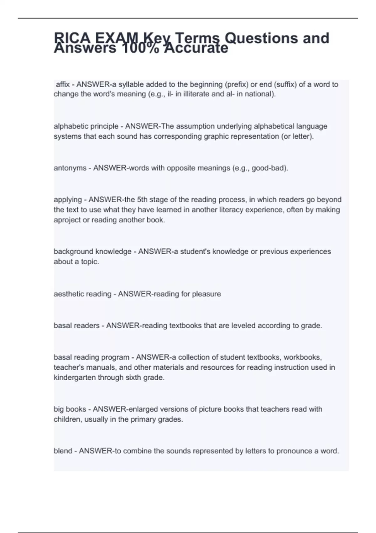 RICA EXAM Key Terms Questions and Answers 100% Accurate