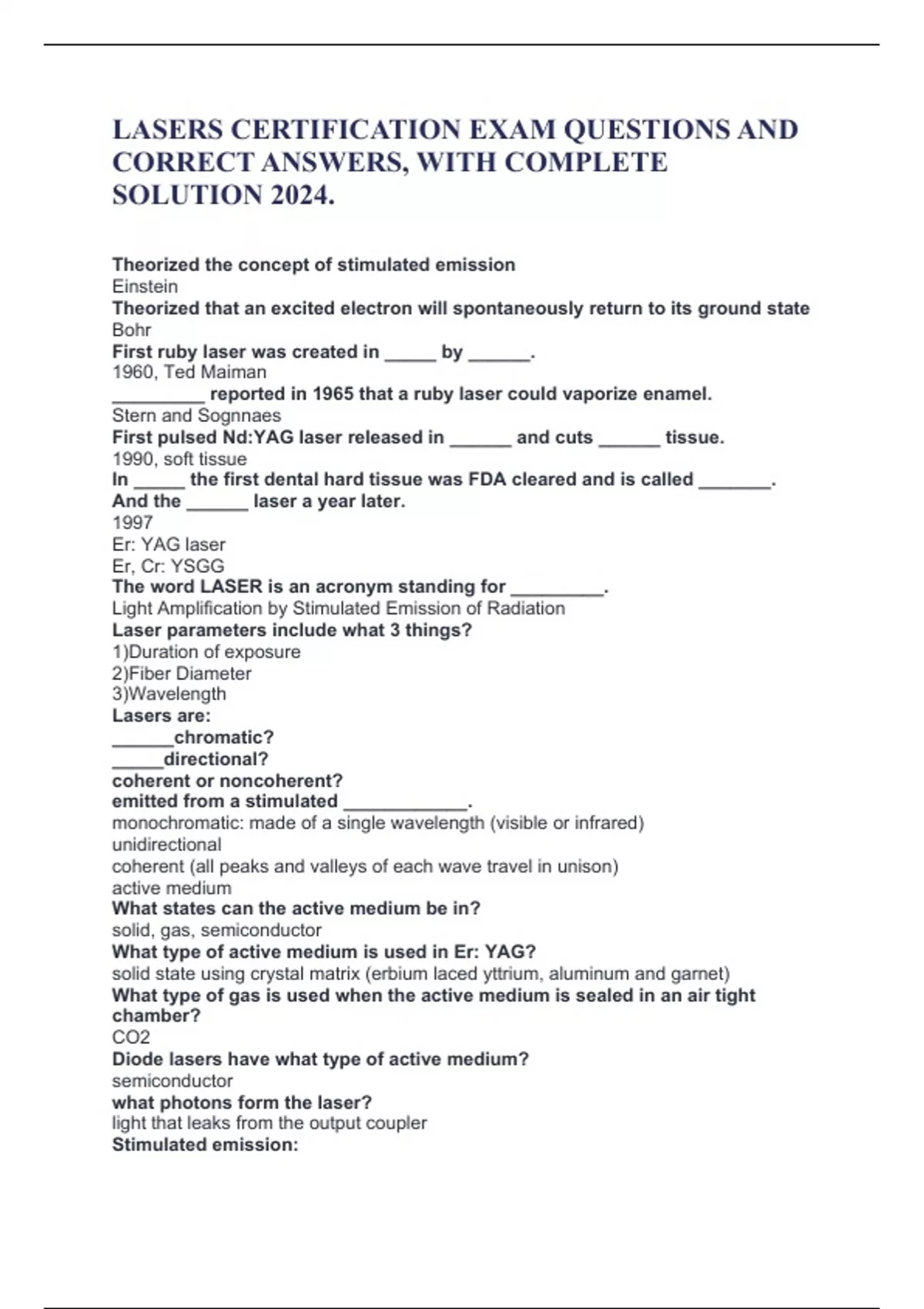 LASERS CERTIFICATION EXAM QUESTIONS AND CORRECT ANSWERS, WITH COMPLETE SOLUTION 2024. Theorized the concept of stimulated emission Einstein Theorized that an excited electron will spontaneously return to its ground state Bohr First ruby laser was created in _____ by ______. 1960, Ted Maiman _________ reported in 1965 that a ruby laser could vaporize enamel. Stern and Sognnaes First pulsed Nd:YAG laser released in ______ and cuts ______ tissue. 1990, soft tissue In _____ the first dental hard tissue was FDA cleared and is called _______. And the ______ laser a year later. 1997 Er: YAG laser Er, Cr: YSGG The word LASER is an acronym standing for _________. Light Amplification by Stimulated Emission of Radiation Laser parameters include what 3 things? 1)Duration of exposure 2)Fiber Diameter 3)Wavelength Lasers are: ______chromatic? _____directional? coherent or noncoherent? emitted from a stimulated ____________. monochromatic: made of a single wavelength (visible or infrared) unidirectional coherent (all peaks and valleys of each wave travel in unison) active medium What states can the active medium be in? solid, gas, semiconductor What type of active medium is used in Er: YAG? solid state using crystal matrix (erbium laced yttrium, aluminum and garnet) What type of gas is used when the active medium is sealed in an air tight chamber? CO2 Diode lasers have what type of active medium? semiconductor what photons form the laser? light that leaks from the output coupler Stimulated emission: