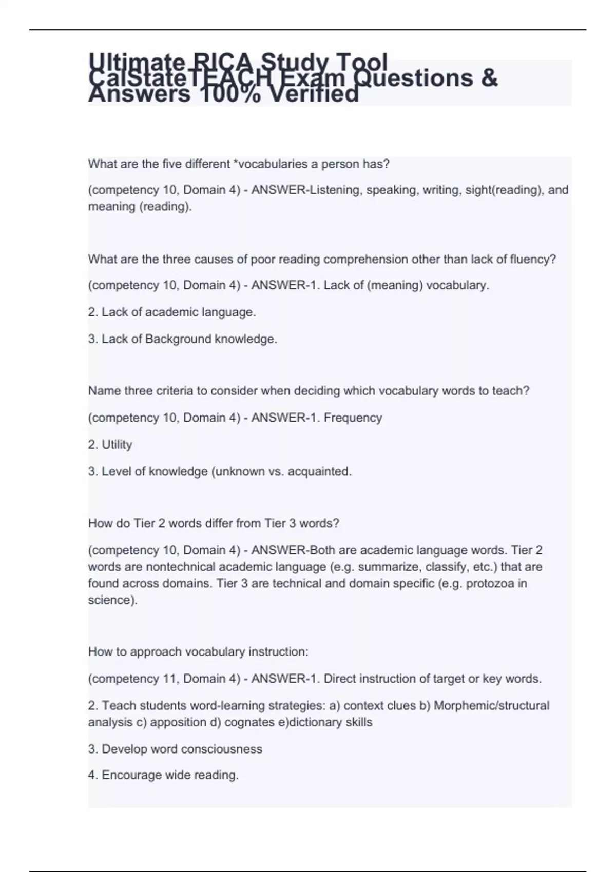 What are the five different *vocabularies a person has? (competency 10, Domain 4) - ANSWER-Listening, speaking, writing, sight(reading), and meaning (reading). What are the three causes of poor reading comprehension other than lack of fluency? (competency 10, Domain 4) - ANSWER-1. Lack of (meaning) vocabulary. 2. Lack of academic language. 3. Lack of Background knowledge. Name three criteria to consider when deciding which vocabulary words to teach? (competency 10, Domain 4) - ANSWER-1. Frequency 2. Utility 3. Level of knowledge (unknown vs. acquainted. How do Tier 2 words differ from Tier 3 words? (competency 10, Domain 4) - ANSWER-Both are academic language words. Tier 2 words are nontechnical academic language (e.g. summarize, classify, etc.) that are found across domains. Tier 3 are technical and domain specific (e.g. protozoa in science). How to approach vocabulary instruction: (competency 11, Domain 4) - ANSWER-1. Direct instruction of target or key words. 2. Teach students word-learning strategies: a) context clues b) Morphemic/structural analysis c) apposition d) cognates e)dictionary skills