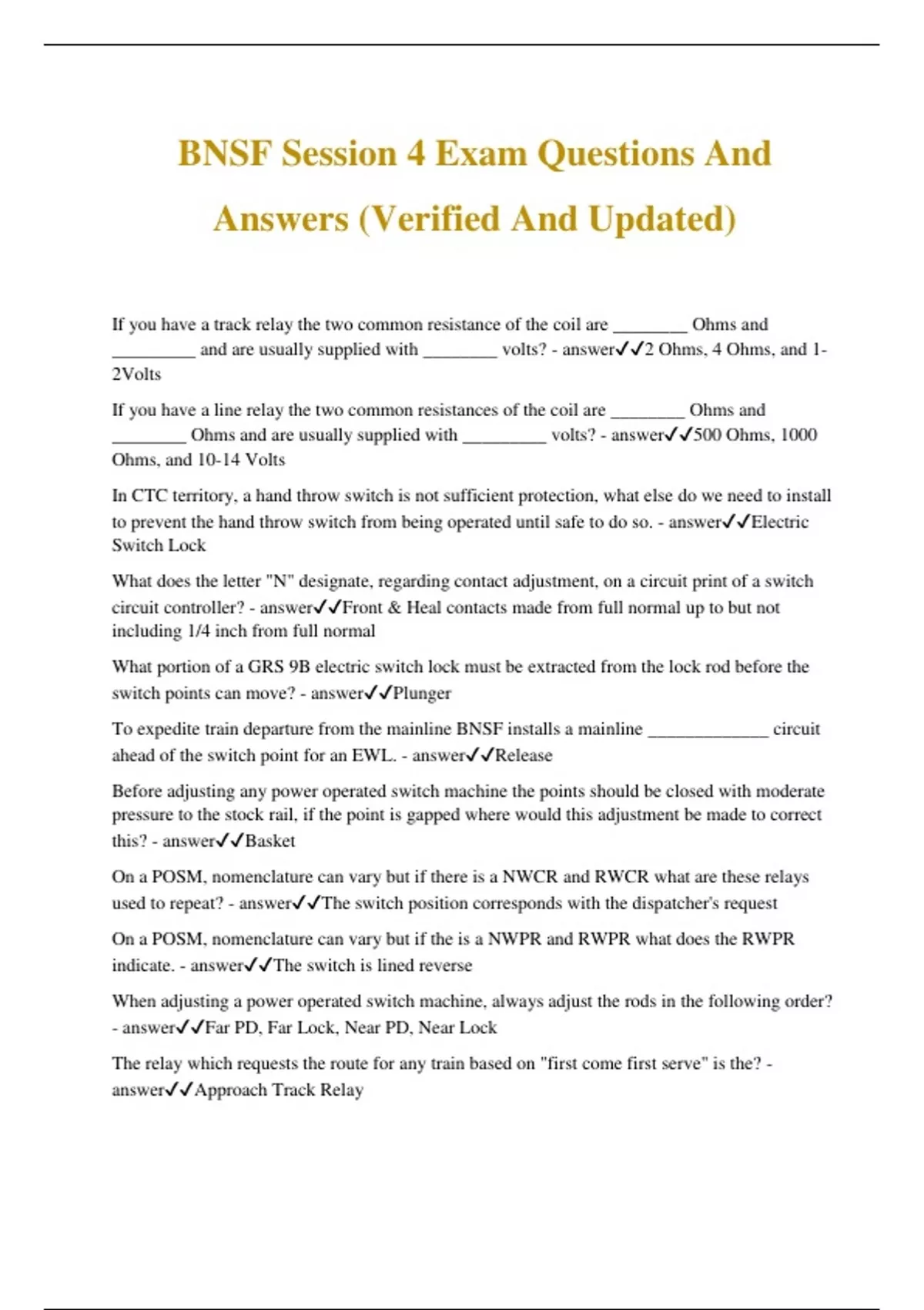 BNSF Session 4 Exam Questions And Answers (Verified And Updated) If you have a track relay the two common resistance of the coil are ________ Ohms and _________ and are usually supplied with ________ volts? - answer2 Ohms, 4 Ohms, and 1- 2Volts If you have a line relay the two common resistances of the coil are ________ Ohms and ________ Ohms and are usually supplied with _________ volts? - answer500 Ohms, 1000 Ohms, and 10-14 Volts In CTC territory, a hand throw switch is not sufficient protection, what else do we need to install to prevent the hand throw switch from being operated until safe to do so. - answerElectric Switch Lock What does the letter "N" designate, regarding contact adjustment, on a circuit print of a switch circuit controller? - answerFront & Heal contacts made from full normal up to but not including 1/4 inch from full normal What portion of a GRS 9B electric switch lock must be extracted from the lock rod before the switch points can move? - answerPlunger To expedite train departure from the mainline BNSF installs a mainline _____________ circuit ahead of the switch point for an EWL. - answerRelease Before adjusting any power operated switch machine the points should be closed with moderate pressure to the stock rail, if the point is gapped where would this adjustment be made to correct this? - answerBasket On a POSM, nomenclature can vary but if there is a NWCR and RWCR what are these relays used to repeat? - answerThe switch position corresponds with the dispatcher's request On a POSM, nomenclature can vary but if the is a NWPR and RWPR what does the RWPR indicate. - answerThe switch is lined reverse When adjusting a power operated switch machine, always adjust the rods in the following order? - answerFar PD, Far Lock, Near PD, Near Lock The relay which requests the route for any train based on "first come first serve" is the? - answerApproach Track Relay The relay which requests and establishes the route? - answerRoute Relay and the Route Repeater Relay The relay which changes the signal aspect is the? - answerHome Relay The relay which prevents a signal clearing behind a train as it leaves the interlocker is the? - answerStick Relay A _____________ _____ _________ of 5 seconds or less shall not permit an established rout to be changed at an automatic interlocking - answerloss of shunt (FRA 236.309) ___________ locking prevents opposing signals from clearing once a train has a proceed signal in the route. - answerTraffic Locking (FRA 236.769) Approach or time locking shall be provided for all interlocker signals capable of displaying aspects more favorable than? - answerProceed at restricted speed (FRA 236.305) Nemonic for Interlocking: Owning Real Expensive Luxury Cars Lets People Realize UR Rich - answerOccupy the Track Request the Track Establish the Route Lock the Route Clear the Signal Light the Signal Pick the Stick Release the Route