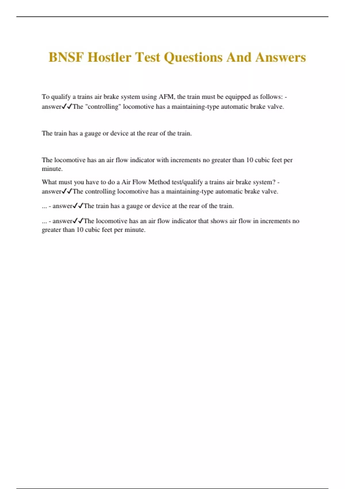 BNSF Hostler Test Questions And Answers To qualify a trains air brake system using AFM, the train must be equipped as follows: - answerThe "controlling" locomotive has a maintaining-type automatic brake valve. The train has a gauge or device at the rear of the train.