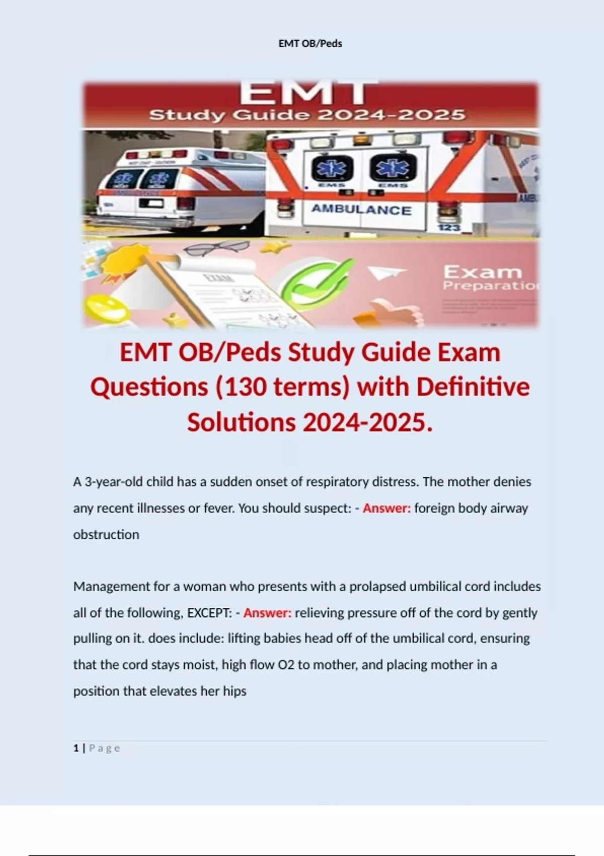 EMT OB/Peds Study Guide Exam Questions (130 terms) with Definitive Solutions .