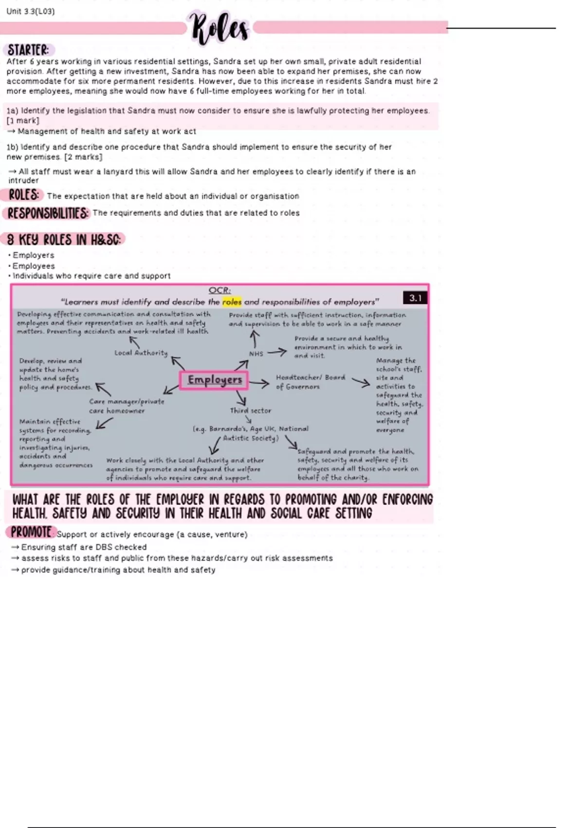 Includes roles of employers as well as examples of employers in health and social care sector. Includes promoting and enforcing health safety and security and exam questions and answers