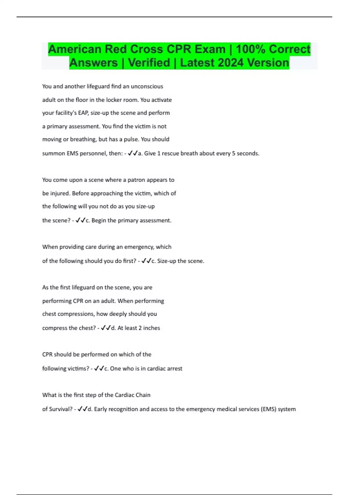 American Red Cross CPR Exam | 100% Correct Answers | Verified | Latest 2024 Version